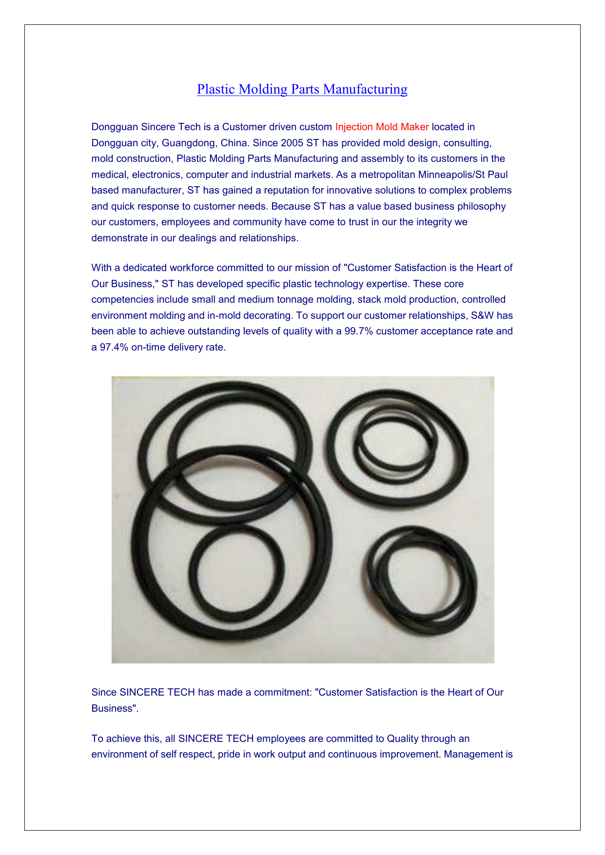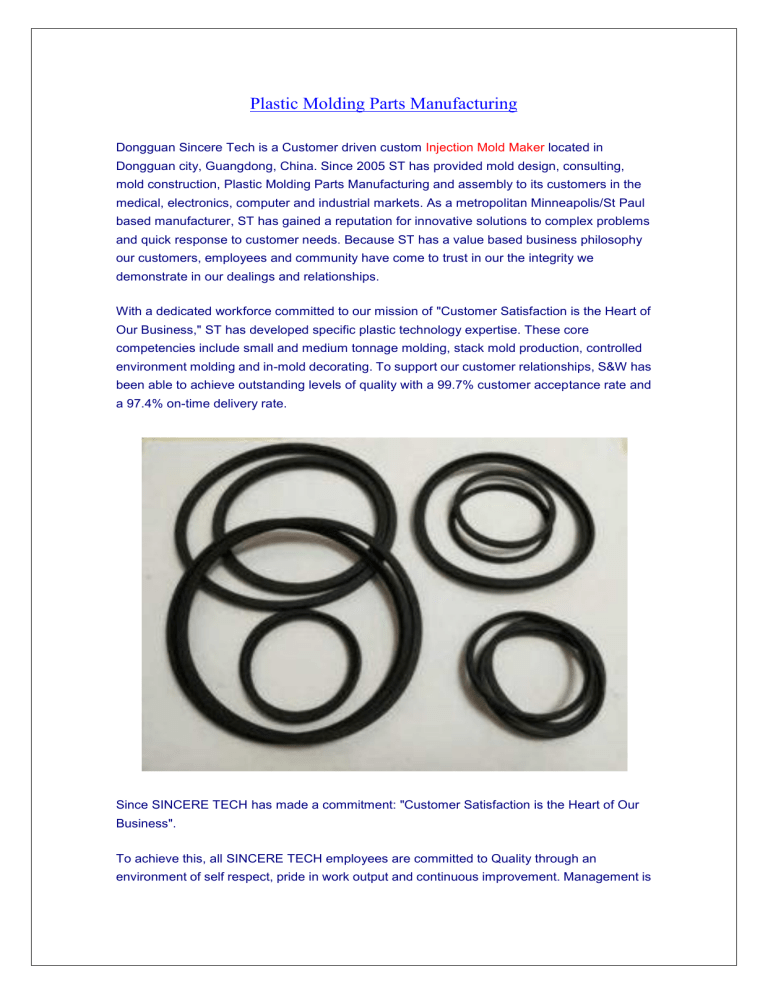 Plastic Molding Parts Manufacturing Dongguan Sincere Tech is a Customer driven custom Injection Mold Maker located in Dongguan city, Guangdong, China. Since 2005 ST has provided mold design, consulting, mold construction, Plastic Molding Parts Manufacturing and assembly to its customers in the medical, electronics, computer and industrial markets. As a metropolitan Minneapolis/St Paul based manufacturer, ST has gained a reputation for innovative solutions to complex problems and quick response to customer needs. Because ST has a value based business philosophy our customers, employees and community have come to trust in our the integrity we demonstrate in our dealings and relationships. With a dedicated workforce committed to our mission of "Customer Satisfaction is the Heart of Our Business," ST has developed specific plastic technology expertise. These core competencies include small and medium tonnage molding, stack mold production, controlled environment molding and in-mold decorating. To support our customer relationships, S&W has been able to achieve outstanding levels of quality with a 99.7% customer acceptance rate and a 97.4% on-time delivery rate. Since SINCERE TECH has made a commitment: "Customer Satisfaction is the Heart of Our Business". To achieve this, all SINCERE TECH employees are committed to Quality through an environment of self respect, pride in work output and continuous improvement. Management is committed to support this effort by providing employees with appropriate training, equipment and current technology. It is the goal of all employees to fully understand the requirements of our customers, both internal and external, and to deliver products and services that satisfy those requirements at a defect-free level. Silicone Injection Molding China Plastic Molding Parts Manufacturing Injection Molded Plastic Parts Our Manufacturing Capabilities Basic Services Available to Meet Customer Requirements Concept Phase Plastic part design Prototype Plastic molds Early project management involvement Detailed quotes Design Services preliminary mold design design review prototype or models moldflow analysis final mold design concurrent engineering Plastic Mold Manufacturing short lead times full capability mold construction mold sampling cell mold qualification First Article Reports project control & reports prototype & production molds sampled bridge to production short run capability Quality Planning DOE SPC inspection startup, in-process process study capabilities First Article Reporting (FAR) Manufacturing documented work instructions (MPF) injection presses 38-300 ton SPI certified operators OSHA audit - zero deficiencies complete value added services available controlled environment molding emphasis on automation For more information visit here… https://www.plasticmold.net/silicone-injection-molding-china/ Contact our team if you are looking for injection mold maker and Injection Molding China Company, we will offer you the best price and quality.
