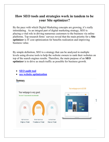 How SEO tools and strategies work in tandem to be your Site optimizer? By the pace with which Digital Marketing concepts are growing, it’s really intimidating. As an integral part of digital marketing strategy, SEO is playing a vital role in driving numerous customers to the business via online platforms. Top research firms’ surveys reveal that the main priority for a Site optimizer is IT cost optimization for benefits realization and improving business value. By simple definition, SEO is a strategy that can be analyzed in multiple levels using diverse tools to help the website owners to rank their websites on top of the search engines results. Therefore, the main purpose of an SEO optimizer is to drive as much traffic as possible for business growth. SEO audit tool seo website optimization Interestingly, just fixing the simple SEO elements can make a huge impact for smaller and simpler sites while SEO is more complex and involves a broad scope of considerations when websites run several sections deep. Therefore, you may see that some small businesses are running full time depending on marketing experts, while large enterprises seek the collaboration of expert strategies with tools. For More Information site optimization Visit Here :https://www.elitesiteoptimizer.com/ How the SEO tools could be your Site Optimizer? Every single tool that is available for optimization holds a substantial value. A professional Site optimizer knows that tools are just a means for achieving the goals for your website. 1) Website performance statistics: Having a comprehensive tool in place will help you find your website’s information and how it is performing overall. Site optimizers will analyze the conversions and collect every piece of information of the incoming links. Site optimizer in the form of such a tool will enable you to determine traffic you receive on your website and backtrack the link to find the bounce rate, referral sites, and much more. Speed Update: It is meant for adding mobile speed to the ranking factors of the search engine’s list. This factor will help the SEO optimizers to understand how fast their website page loads and what are the existing issues in the website. Thus, the SEO will be able to fix the problems ASAP. 2) Role of reports :As there is none optimization protocol for websites, the Site optimizer tools are the best thing to use. The tools will let you gather info in a particular format. The information will be stored as user behavior reports which will contain tons of data. It will give you intel regarding about the people who click on your website, their scrolls, location, and other useful information. 3) CMS: Some content management systems such as Wordpress come with an advantage of handy plugins tocover the SEO basics each time you create a new page or blog post for the website. You will need to install the plugin on the website and activate it. Just as the plugin gets active, you will be able to access all of its features. It gives you the SEO score and readability analysis of the website. If the website needs any kind of improvement, then the tool will notify you of every single aspect that needs to be optimized, thus being a classic site optimizer. You can also check whether the keywords are focused on the webpage or not. Website optimization spell check website Here is the list of best tools without which you won’t be able to conduct the optimization techniques. 1) Crazy Egg: As there is no optimization protocol for websites, the Site optimizer tools are the best thing to use. Among the tools, Crazy Egg will let you gather info in a particular format. The information will be stored as user behavior reports which will contain tons of data. It will give you intel regarding about the people who click on your website, their scrolls, location, and other useful information. 2) Google Search Console: As Google Webmaster Tools is now called Google Search Console, it is not just the name which is changed. It is a comprehensive tool to find your website’s information and how it is performing overall. GSC will analyze the conversions and collect every piece of information of the incoming links. With this tool, you will be able to determine how much traffic you are getting on your website and back-track the link to find the bounce rate, referral sites, and much more. 3) GTmetrix:Recently Google announced the Speed Update to this tool. It is meant for adding mobile speed to the ranking factors of the search engine’s list. This tool will help the SEO optimizers to understand how fast their website page loads and what are the existing issues in the website. Thus, the SEO will be able to fix the problems ASAP. 4) Elite Site Optimizer: True to its name this website optimizer was built with the goal of finding new SEO opportunities for the businesses. This site optimizer is dovetailed with the business intelligence capabilities to deliver to the website owners the SEO insights and the gaps their websites to make informed decisions. Internal link checker is one of the unique features that will help identify the SEO issues even in the development and staging environment to ensure a page is successful when it goes live. 5) Yoast SEO:It is a handy plugin that ensures that the SEO optimizer is covering the bases each time when you create a new page or blog post for the website. You will need to install the plugin on Wordpress website and activate it. Just as the plugin gets active, you will be able to access all of its features. It gives you the SEO score and readability analysis of the website. If the website needs any kind of improvement, then the tool will notify you of every single aspect that needs to be optimized. You can have an in-depth analysis of both fronts. You can also check whether the keywords are focused on the webpage or not. Every single tool that is available for optimization holds a substantial value. So, don’t just think of getting one and believe tha
