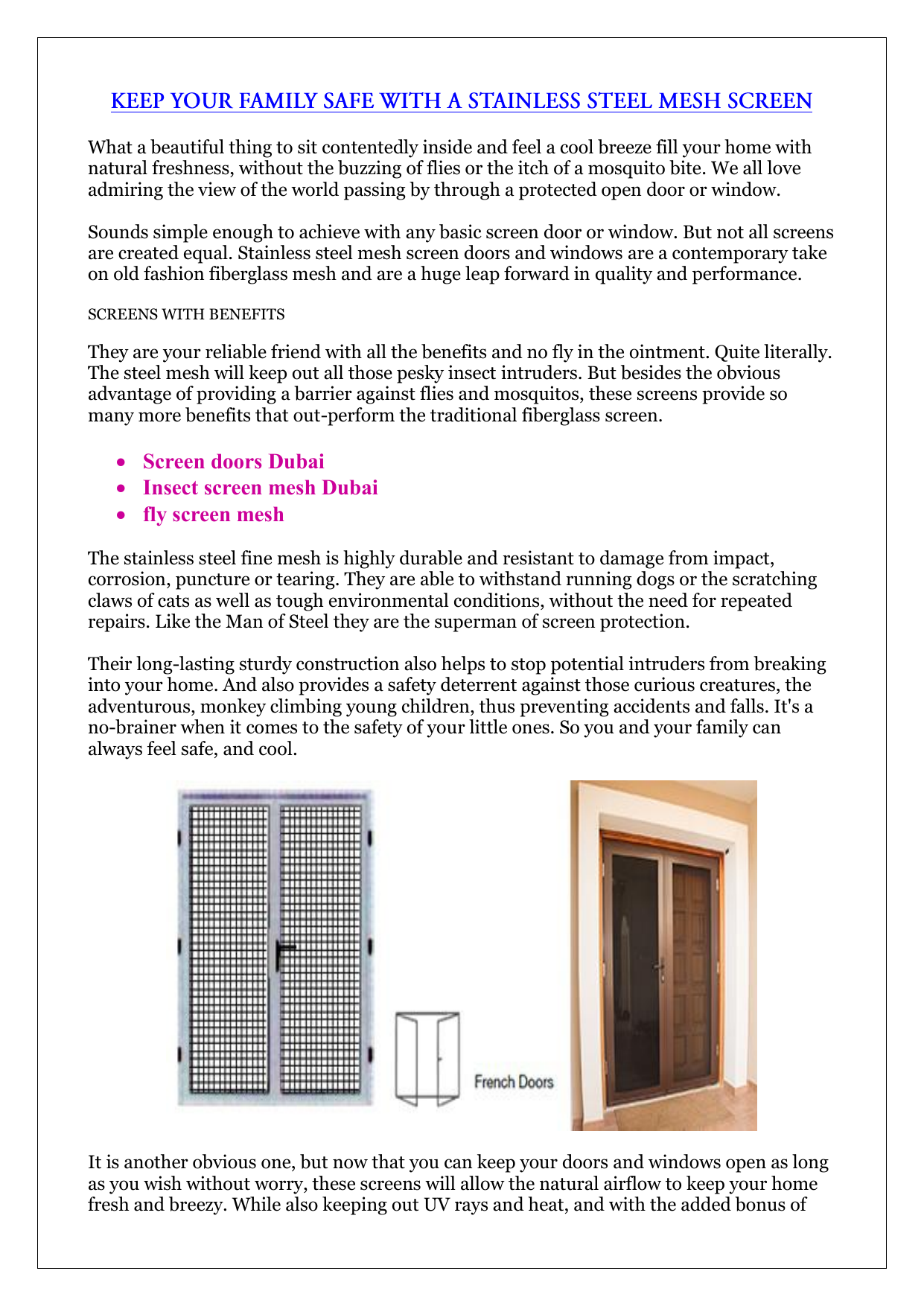 What a beautiful thing to sit contentedly inside and feel a cool breeze fill your home with natural freshness, without the buzzing of flies or the itch of a mosquito bite. We all love admiring the view of the world passing by through a protected open door or window. Sounds simple enough to achieve with any basic screen door or window. But not all screens are created equal. Stainless steel mesh screen doors and windows are a contemporary take on old fashion fiberglass mesh and are a huge leap forward in quality and performance. SCREENS WITH BENEFITS They are your reliable friend with all the benefits and no fly in the ointment. Quite literally. The steel mesh will keep out all those pesky insect intruders. But besides the obvious advantage of providing a barrier against flies and mosquitos, these screens provide so many more benefits that out-perform the traditional fiberglass screen. Screen doors Dubai Insect screen mesh Dubai fly screen mesh The stainless steel fine mesh is highly durable and resistant to damage from impact, corrosion, puncture or tearing. They are able to withstand running dogs or the scratching claws of cats as well as tough environmental conditions, without the need for repeated repairs. Like the Man of Steel they are the superman of screen protection. Their long-lasting sturdy construction also helps to stop potential intruders from breaking into your home. And also provides a safety deterrent against those curious creatures, the adventurous, monkey climbing young children, thus preventing accidents and falls. It's a no-brainer when it comes to the safety of your little ones. So you and your family can always feel safe, and cool. It is another obvious one, but now that you can keep your doors and windows open as long as you wish without worry, these screens will allow the natural airflow to keep your home fresh and breezy. While also keeping out UV rays and heat, and with the added bonus of reducing your energy bill. It is nature's air conditioning. They have a pleasing appearance and don't stand out as much as you might think due to their fine mesh construction. They will be an improvement to the standard of your villa, without compromising the overall facade. They are easy to maintain with occasional simple dusting and wipe washing to ensure they always look good and last. It's all you need do. Nothing else. For more information visit here… https://safetyscreens.ae/screen-doors/ THE STAINLESS STEEL SCREEN IS EVERYTHING YOU NEED You can be confident of its endurance and performance, with peace of mind that it is worth the long-lasting investment. It does its job and serves you well. All of these benefits can easily be enjoyed while still maintaining good visibility so your view of the outdoors remains unimpaired and beautiful. This is the whole point of having a window or glass door, to see outside and let in the light, and the steel mesh screen does not compromise on that. When you leave your door open, your life is always open to opportunity, and “happiness often sneaks in a door you didn't know you left open.” (John Barrymore)