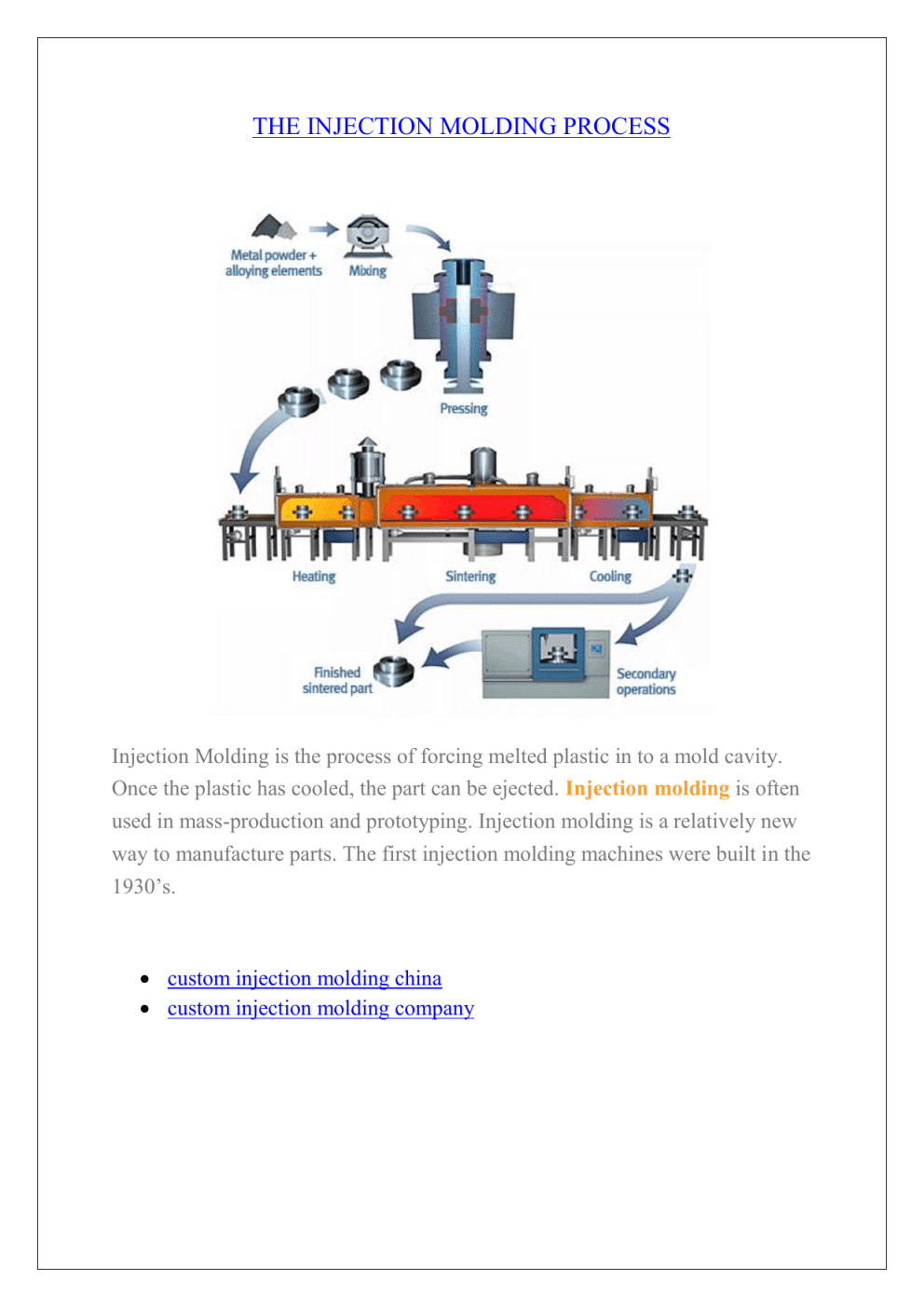 THE INJECTION MOLDING PROCESS Injection Molding is the process of forcing melted plastic in to a mold cavity. Once the plastic has cooled, the part can be ejected. Injection molding is often used in mass-production and prototyping. Injection molding is a relatively new way to manufacture parts. The first injection molding machines were built in the 1930’s. custom injection molding china custom injection molding company THERE ARE SIX MAJOR STEPS IN THE INJECTION MOLDING PROCESS: 1. Clamping An injection molding machine constists of three basic parts; the mold plus the clamping and injection units. The clamping unit is what holds the mold under pressure during the injection and cooling. Basically, it holds the two halves of the injection mold together. 2. Injection During the injection phase, plastic material, usually in the form of pellets, are loaded into a hopper on top of the injection unit. The pellets feed into the cylinder where they are heated until they reach molten form (think of how a hot glue gun works here). Within the heating cylinder there is a motorized screw that mixes the molten pellets and forces them to end of the cylinder. Once enough material has accumulated in front of the screw, the injection process begins. The molten plastic is inserted into the mold through a sprue, while the pressure and speed are controled by the screw. Note: some injection molding machines use a ram instead of a screw. 3. Dwelling The dwelling phase consits of a pause in the injection process. The molten plastic has been injected into the mold and the pressure is applied to make sure all of the mold cavities are filled. 4. Cooling The plastic is allowed to cool to its solid form within the mold. 5. Mold Opening The clamping unit is opened, which seperates the two halves of the mold. 6. Ejection An ejecting rod and plate eject the finished piece from the mold. The un-used sprues and runners can be recycled for use again in future molds. For more information visit here…. https://www.molding-plastic.com/ Advantages of Injection Molding High production rates High tolerances are repeatable Wide range of materials can be used Low labor costs Minimal scrap losses Little need to finish parts after molding Disadvantages of Injection Molding Expensive equipment investment Running costs may be high Parts must be designed with molding consideration