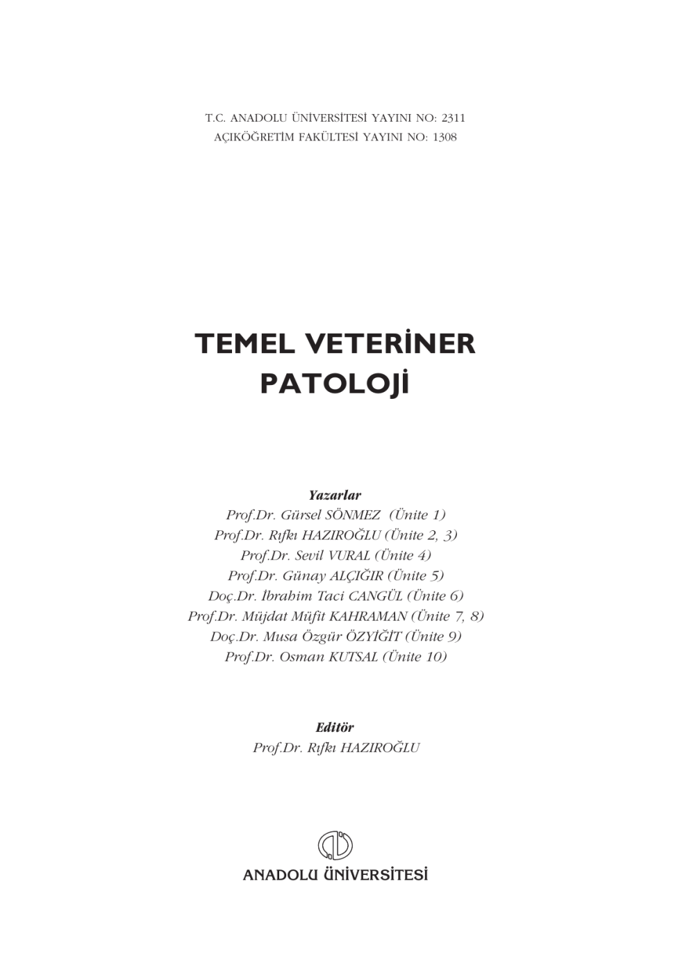 T.C. ANADOLU ÜN‹VERS‹TES‹ YAYINI NO: 2311 AÇIKÖ⁄RET‹M FAKÜLTES‹ YAYINI NO: 1308 TEMEL VETER‹NER PATOLOJ‹ Yazarlar Prof.Dr. Gürsel SÖNMEZ (Ünite 1) Prof.Dr. R›fk› HAZIRO⁄LU (Ünite 2, 3) Prof.Dr. Sevil VURAL (Ünite 4) Prof.Dr. Günay ALÇI⁄IR (Ünite 5) Doç.Dr. ‹brahim Taci CANGÜL (Ünite 6) Prof.Dr. Müjdat Müfit KAHRAMAN (Ünite 7, 8) Doç.Dr. Musa Özgür ÖZY‹⁄‹T (Ünite 9) Prof.Dr. Osman KUTSAL (Ünite 10) Editör Prof.Dr. R›fk› HAZIRO⁄LU ANADOLU ÜN‹VERS‹TES‹ Bu kitab›n bas›m, yay›m ve sat›fl haklar› Anadolu Üniversitesine aittir. “Uzaktan Ö¤retim” tekni¤ine uygun olarak haz›rlanan bu kitab›n bütün haklar› sakl›d›r. ‹lgili kurulufltan izin almadan kitab›n tümü ya da bölümleri mekanik, elektronik, fotokopi, manyetik kay›t veya baflka flekillerde ço¤alt›lamaz, bas›lamaz ve da¤›t›lamaz. Copyright © 2011 by Anadolu University All rights reserved No part of this book may be reproduced or stored in a retrieval system, or transmitted in any form or by any means mechanical, electronic, photocopy, magnetic, tape or otherwise, without permission in writing from the University. UZAKTAN Ö⁄RET‹M TASARIM B‹R‹M‹ Genel Koordinatör Prof.Dr. Levent K›l›ç Genel Koordinatör Yard›mc›s› Prof.Dr. Müjgan Yaz›c› Ö¤retim Tasar›mc›lar› Prof.Dr. Murat Ataizi Doç.Dr. Figen Ünal Çolak Grafik Tasar›m Yönetmenleri Prof. Tevfik Fikret Uçar Dr.Ö¤r.Üyesi Nilgün Salur Ö¤r.Gör. Cemalettin Y›ld›z Ölçme De¤erlendirme Sorumlusu Ö¤r.Gör. Emrah Emre Özkeskin Grafikerler Nihal Sürücü Hazal Y›ld›r›m Adnan Çamur Kitap Koordinasyon Birimi Doç.Dr. Feyyaz Bodur Ö¤r.Gör. Nermin Özgür Kapak Düzeni Prof. Tevfik Fikret Uçar Dizgi Aç›kö¤retim Fakültesi Dizgi Ekibi Temel Veteriner Patoloji E-ISBN 978-975-06-2758-3 Bu kitab›n tüm haklar› Anadolu Üniversitesi’ne aittir. ESK‹fiEH‹R, A¤ustos 2018 2258-0-0-0-1809-V01 iii ‹çindekiler ‹çindekiler Önsöz ............................................................................................................ ix Veteriner Patoloji ve Laboratuar› ......................................... 3 VETER‹NER PATOLOJ‹’YE G‹R‹fi ................................................................. Veteriner Patoloji’nin Bölümleri .................................................................. PATOLOJ‹ LABORATUARI VE GÜVENL‹K.................................................. Biyozararl›lar ve Zararl› Kimyasal Maddeler .............................................. Patoloji Laboratuarlar›nda Korunma ........................................................... Patoloji Laboratuarlar›nda Dikkat Edilecek Noktalar .................................. Patolojide Kullan›lan Bafll›ca Kimyasal Maddelerin Zararlar› ve Korunma Özet ............................................................................................................... Kendimizi S›nayal›m ..................................................................................... Kendimizi S›nayal›m Yan›t Anahtar› ............................................................ S›ra Sizde Yan›t Anahtar› .............................................................................. Yararlan›lan ve Baflvurulabilecek Kaynaklar ............................................... 3 3 4 5 5 7 10 13 14 15 15 15 Örnek Alma ve Mikroskobik ‹nceleme Süreci ..................... 17 G‹R‹fi .............................................................................................................. Canl› Örnek ‹ncelemeleri.............................................................................. Cans›z Örnek ‹ncelemeleri ........................................................................... ÖRNEK ALMA VE MAKROSKOB‹K DE⁄ERLEND‹RME.............................. Otoliz ............................................................................................................. Örnek Alma ................................................................................................... Makroskobik De¤erlendirme ....................................................................... TESP‹T (F‹KZASYON)................................................................................... Tespit Solüsyonunun Amaca Göre Seçimi ............................................ Tespit Solüsyonunun Miktar›.................................................................. Tespit Solüsyonunun pH’s› ................................................................... Tespit Süresi ........................................................................................... Tespit Uygulama Teknikleri ................................................................... En Çok Kullan›lan Tespit Solüsyonlar› .................................................. Birkaç Kimyasal ‹çeren ve Çok Kullan›lan Tespit Solüsyonlar› ........... Tespit Hatalar› (artefakt)......................................................................... Sitopatolojide Tespit................................................................................ Elektron Mikroskopide Tespit ................................................................ Dekalsifikasyon (kalsiyumsuzlaflt›rma) .................................................. DOKU ‹fiLENMES‹ SÜREC‹ ........................................................................... Y›kama ........................................................................................................... Dehidrasyon (Suyu Giderme) ................................................................ Saydamlaflt›rma (Alkolü Giderme) ......................................................... Emdirme ................................................................................................. Otomatik Doku ‹fllenmesi .............................