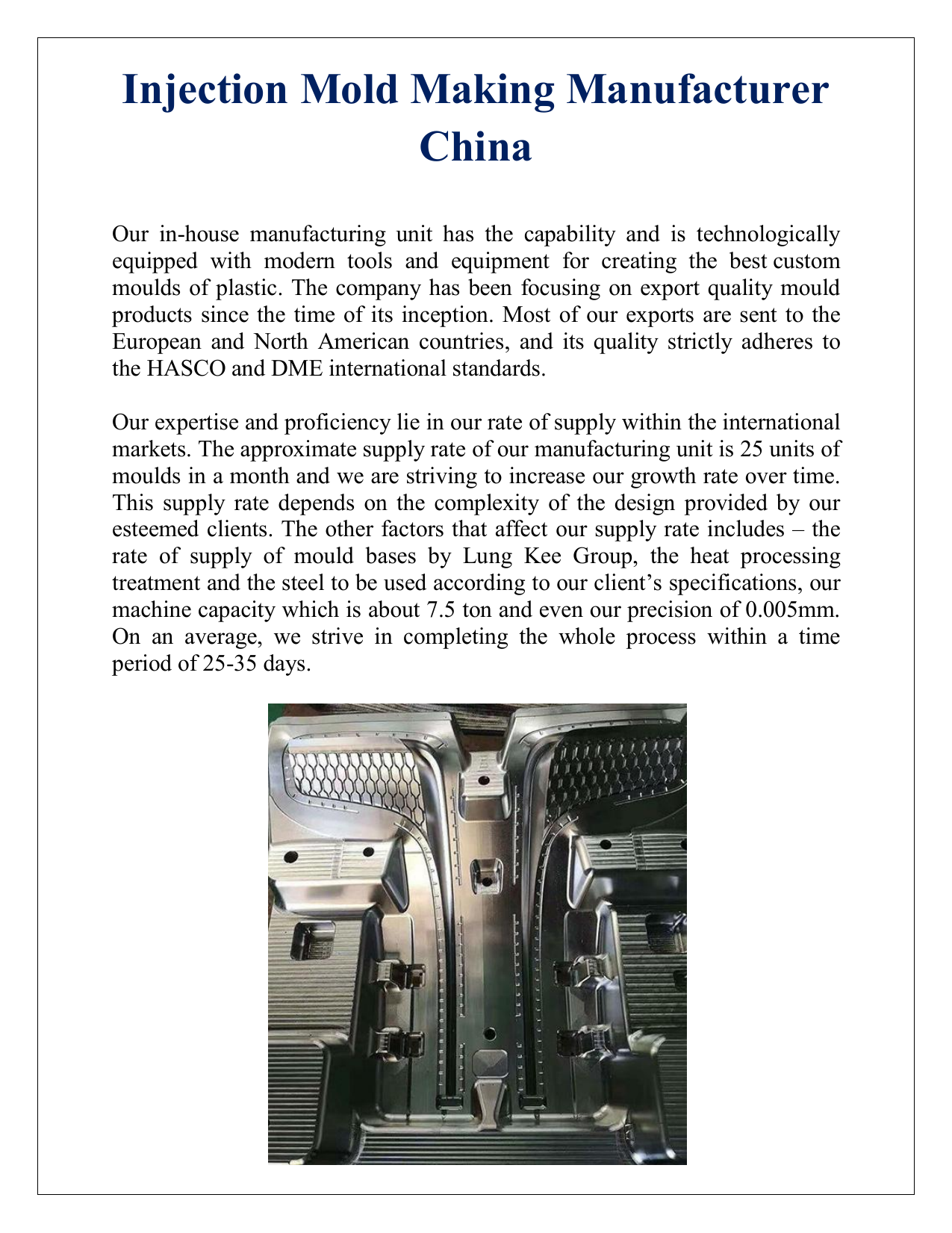 Injection Mold Making Manufacturer China Our in-house manufacturing unit has the capability and is technologically equipped with modern tools and equipment for creating the best custom moulds of plastic. The company has been focusing on export quality mould products since the time of its inception. Most of our exports are sent to the European and North American countries, and its quality strictly adheres to the HASCO and DME international standards. Our expertise and proficiency lie in our rate of supply within the international markets. The approximate supply rate of our manufacturing unit is 25 units of moulds in a month and we are striving to increase our growth rate over time. This supply rate depends on the complexity of the design provided by our esteemed clients. The other factors that affect our supply rate includes – the rate of supply of mould bases by Lung Kee Group, the heat processing treatment and the steel to be used according to our client’s specifications, our machine capacity which is about 7.5 ton and even our precision of 0.005mm. On an average, we strive in completing the whole process within a time period of 25-35 days. Plastic Mold Manufacturer China Mold Manufacturer For creating the perfect mould, our manufacturing unit provides various services according to the needs of our clients, which are as followsInsert and Shuttle MouldsInterchangeable and Expandable MouldsMultiple Slide Action MouldsFloating Cavity Plate and Stripper MouldsHot Runner SystemUnscrewing MouldsDie Casting Below is a list of the mould steel our manufacturing unit uses to make the perfect export quality moulds. 1.2344, 1.2343, S136, LKM2316, LKM738H, 1.2083, 1.2312, 1.1730, H13, P20, P20H, P20HH, NK80. Injection Mold Company Injection Mold Making Our manufacturing unit ensures undivided attention of all our staff workers during the process of injection mould making to minimize the costs. Our special attention is what lowers down the cost of making, as compared to other manufacturing units in the competition. Despite all the hurdles and setbacks from our leading suppliers, we ensure quality perfect designs, avoid reworking and practice time efficient processes to ensure the delivery on time. Over the years, our client satisfaction rates have grown exponentially and we are striving to be better for the coming demands of the market. According to our previous year’s reports, there has been a 97% positive feedback for our plastic injection moulds. For More Information Visit Here :- http://www.loxinmold.com/bestinjection-mold-making-manufacturer-in-china/ In-House Moulding Facilities Our in-house manufacturing unit has the best moulding facilities and equipment meant to fulfil all the requirements of our clients. Before placing an order, we encourage our clients to have a tour of our manufacturing facility to build a sense of trust in our company and what we are really capable of. We accept all sorts of orders for custom made plastic injection moulding. Our manufacturing unit houses the China mould maker which has the capacity to create custom plastic injection moulds for the clients at a very cheap and reasonable price. Compare to other machines in the manufacturing unit, the Chine mould maker ensures speed and flawless efficiency at a very low rate. This specific feature makes our manufacturing unit stand at par within the best ranks in the market. Moreover, our moulding solutions have rarely been questioned for its results because we promise the best results. We encourage our customers and clients with a huge or small volume of demand to approach our company for best satisfactory results. Other Services – CNC Machine Parts Along with the plastic injection mould creation, there are other services that our manufacturing unit provides to customers and clients. One such service includes high precision CNC machine parts of plastic moulds. Along with plastic mould, we provide the same machine parts in die casting moulds with a precision of 0.01 – 0.02mm. The products are then sent to the client’s factory for the final fitting process. This is done to ensure that the fittings are done according to the satisfaction of the clients and also to save time – for both the client and even our manufacturing unit. This service can be availed by any client within a short period of time. It might take some extra time for the clients who seek the machine parts in harden treatment steel. The whole process along with the final delivery takes approximately 10 – 18 days, depending on the number of units and the complexity of the whole process.