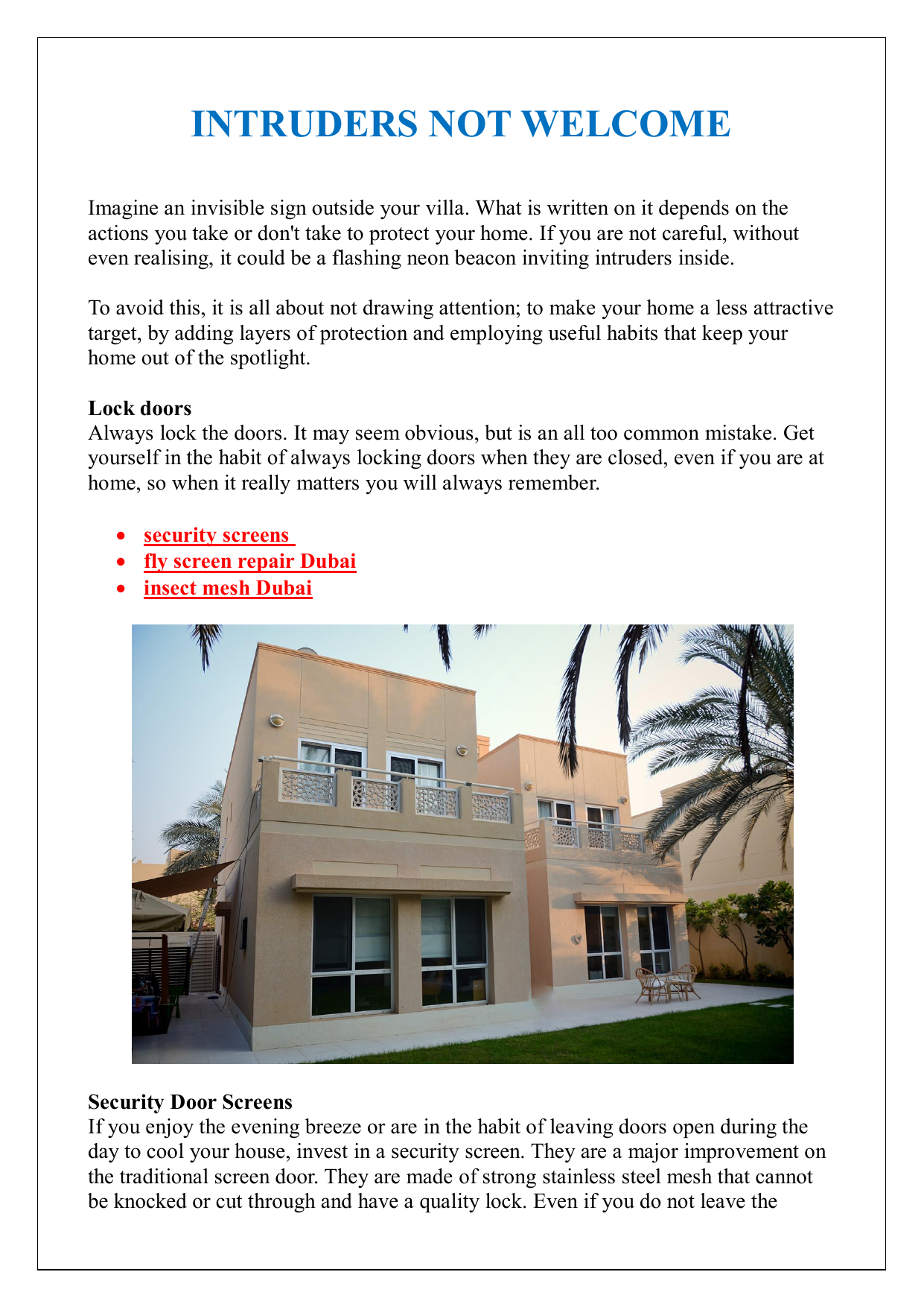 INTRUDERS NOT WELCOME Imagine an invisible sign outside your villa. What is written on it depends on the actions you take or don't take to protect your home. If you are not careful, without even realising, it could be a flashing neon beacon inviting intruders inside. To avoid this, it is all about not drawing attention; to make your home a less attractive target, by adding layers of protection and employing useful habits that keep your home out of the spotlight. Lock doors Always lock the doors. It may seem obvious, but is an all too common mistake. Get yourself in the habit of always locking doors when they are closed, even if you are at home, so when it really matters you will always remember. security screens fly screen repair Dubai insect mesh Dubai Security Door Screens If you enjoy the evening breeze or are in the habit of leaving doors open during the day to cool your house, invest in a security screen. They are a major improvement on the traditional screen door. They are made of strong stainless steel mesh that cannot be knocked or cut through and have a quality lock. Even if you do not leave the windows or door open, they provide a double security measure. Home security system If your home is not installed with a security system, you can find inexpensive self install system or motion sensor alarms. Even if it does not notify the police, you will know when an access point has been breached, so you can take action. Pet doors Secure large pet doors that could be an easy access to intruders or consider not using anything large enough for a person to fit through. Glass precautions Try to avoid doors with glass near doorknobs, as it is easy to break glass and twist a knob or pull a handle to open. If you do have all glass doors, consider key locks or the steel mesh screen security door mentioned above. Concealment Avoid tall or thick shrubs near windows and doors to prevent intruders being able to conceal themselves while attempting a break in. Keep these areas well-lit or use motion sensor floodlights. For More Information Visit Here :- https://safetyscreens.ae/ Dog Consider a guard dog. Even a small yapping breed can be enough of a deterrent. Alternatively hang a 'beware of dog' sign and put dog dishes outside. Or get a bark simulator device activated by sensors. Noise Leave the radio or TV on when out of the house to give the illusion of being home, but not in the middle of the night as that is too obvious. Tools Put away and lock up any tools or possible items outside that could be used to break in. Keep garden sheds locked. Neighbourhood security Many prominent community neighbourhoods have security watch services or neighbourhood watch programs, find out if your home is protected under these services or how you can be part of one. Delivery notes Do not leave notes on doors to delivery personnel indicating you are not home. This is an invitation to intruders. Limit Access Walls, fences or gates are an option, but depending on height and quality can be cut or scaled, especially if there is no barbed wire on top, which is unsightly. Consider high dense hedges with thorns, or a wall topped with thorny running vines or climbing roses. You can even plant these prickly buses under first floor windows. Nature can be your ally. You don't have to be a magician and wave your magic wand to make your house invisible. With these simple measures, changes of habit and security additions, many of which are a low investment cost; anyone can implement them in their homes to stay safe and off the radar of prying eyes.