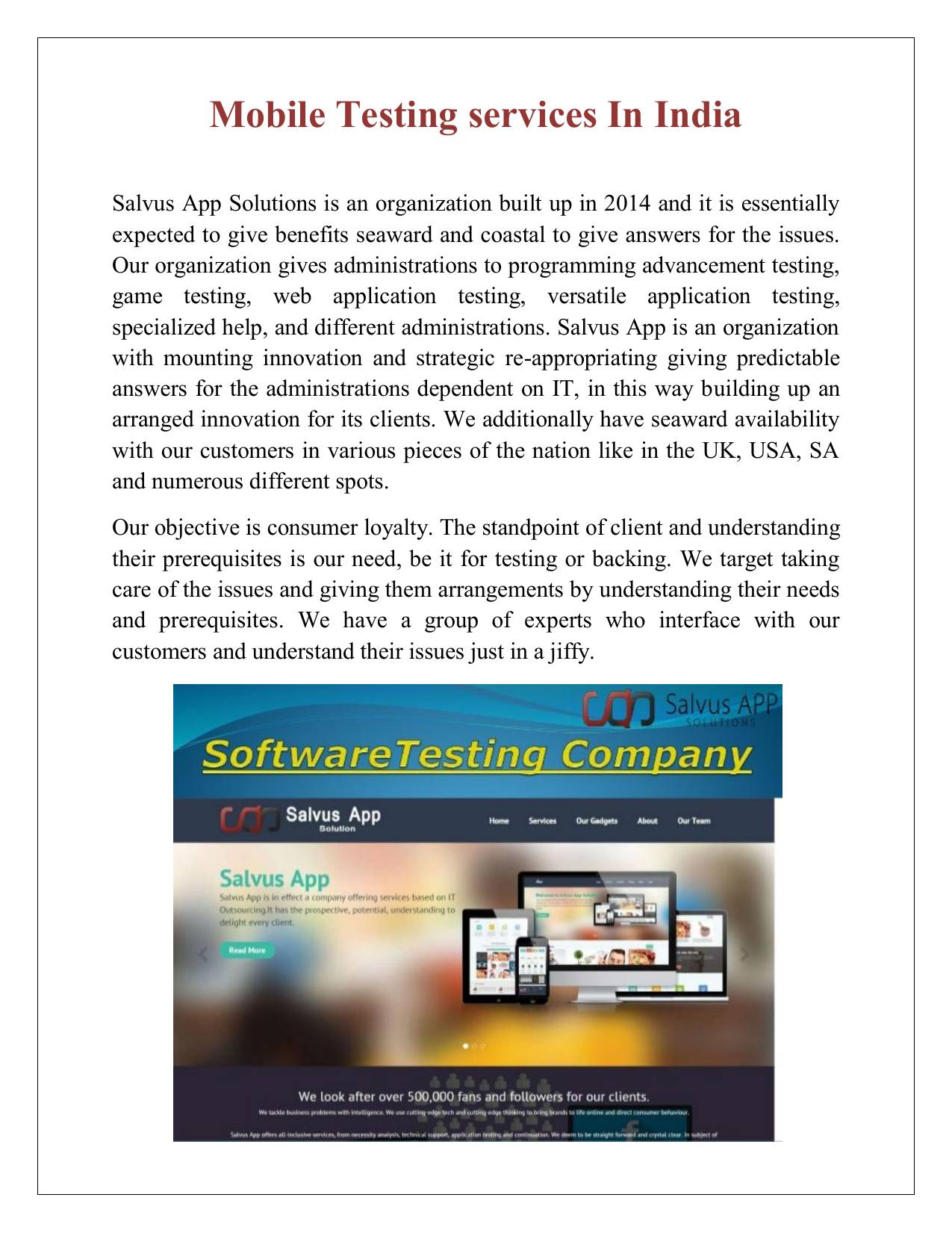 Mobile Testing services In India Salvus App Solutions is an organization built up in 2014 and it is essentially expected to give benefits seaward and coastal to give answers for the issues. Our organization gives administrations to programming advancement testing, game testing, web application testing, versatile application testing, specialized help, and different administrations. Salvus App is an organization with mounting innovation and strategic re-appropriating giving predictable answers for the administrations dependent on IT, in this way building up an arranged innovation for its clients. We additionally have seaward availability with our customers in various pieces of the nation like in the UK, USA, SA and numerous different spots. Our objective is consumer loyalty. The standpoint of client and understanding their prerequisites is our need, be it for testing or backing. We target taking care of the issues and giving them arrangements by understanding their needs and prerequisites. We have a group of experts who interface with our customers and understand their issues just in a jiffy. Mobile Testing Android App Testing iOS App Testing In SDLC, for example programming improvement life cycle, Software testing administrations holds huge significance. Then again, our group of analyzers and the procedure actualized for QA testing likewise assumes a huge job. We appropriately pursue the whole demonstrates of testing and perform testing for various programming like web applications, versatile applications, game testing and parcel more. We get ventures from seaward from our customers. We submit extends by keeping up the quality and bug free report is submitted from our group by remembering the due date given. For More Information Best Mobile Testing Company Visit Here :http://salvusappsolutions.com While, in specialized help administrations, we give bolster administrations to our clients by fathoming their issues and understanding their prerequisites with respect to the portable areas, versatile applications, and so forth. We give 24 x 7 administrations to our clients. We associate our customers by means of telephone, talk or messages. Our point is to comprehend their issues and tackle them. Our help group is associated with keeping themselves refreshed with all the most recent methods, so we can without much of a stretch comprehend their issues and explain them. We are soon to think of couple of new pursuits in its field administrations like web structuring, SEO, BPO, Data passage and substantially more. With a massive foundation in India, we are soon to extend our endeavor in abroad.