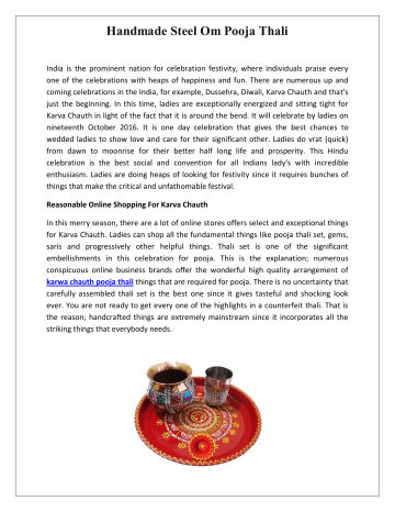 Handmade Steel Om Pooja Thali India is the prominent nation for celebration festivity, where individuals praise every one of the celebrations with heaps of happiness and fun. There are numerous up and coming celebrations in the India, for example, Dussehra, Diwali, Karva Chauth and that's just the beginning. In this time, ladies are exceptionally energized and sitting tight for Karva Chauth in light of the fact that it is around the bend. It will celebrate by ladies on nineteenth October 2016. It is one day celebration that gives the best chances to wedded ladies to show love and care for their significant other. Ladies do vrat (quick) from dawn to moonrise for their better half long life and prosperity. This Hindu celebration is the best social and convention for all Indians lady's with incredible enthusiasm. Ladies are doing heaps of looking for festivity since it requires bunches of things that make the critical and unfathomable festival. Reasonable Online Shopping For Karva Chauth In this merry season, there are a lot of online stores offers select and exceptional things for Karva Chauth. Ladies can shop all the fundamental things like pooja thali set, gems, saris and progressively other helpful things. Thali set is one of the significant embellishments in this celebration for pooja. This is the explanation; numerous conspicuous online business brands offer the wonderful high quality arrangement of karwa chauth pooja thali things that are required for pooja. There is no uncertainty that carefully assembled thali set is the best one since it gives tasteful and shocking look ever. You are not ready to get every one of the highlights in a counterfeit thali. That is the reason; handcrafted things are extremely mainstream since it incorporates all the striking things that everybody needs. Advantages of Online Shopping for Handmade Pooja Thali Likewise, CraftEra is additionally the mainstream and noticeable online dealer that incorporates endless high quality things in their entryway. As of late, it included high quality karwa chauth pooja thali fixings set for hitting festivity with moderate and sensible expense. There are numerous advantages of utilizing of high quality pooja thali in light of the fact that it incorporates numerous things like lota, channi, glass and diya. These all fixings are valuable for pooja that is the reason craftera gives the excellent handcrafted set of thali with every single fundamental component. These handcrafted set made of sparkling brilliant stone pieces, dazzling ribbon, splendid moti globules, lovely print structures, reflect workmanship and progressively different components. It gives the appearance of thali is dazzling, alluring and excellent. Other than this, you can utilize it other profound celebration too. For More Information Colorful Om Pooja Thali Visit Here :https://www.amazon.in/Salvus-App-SOLUTIONS-KarwachauthMulticolour/dp/B01LLN2N72 These carefully assembled karva chauth pooja thali things are most gigantic and amazing embellishments for the brilliant festival. It makes ladies shopping simple and reasonable for blissful festival. Aside from this, this online entrance offers numerous other shocking high quality adornments so ladies can get some one of a kind fundamental things for celebration festivity. This vender likewise offers a restrictive scope of return endowments like adornments, purses, and more others. On the off chance that somebody needs to give return present for their better half in this celebration then they can get wide assortments of items. This arrival blessing thought is the best that give bliss and joy. Thus, the arrival blessings must have a constructive outcome upon her sentiments and stable love and success in each couple.