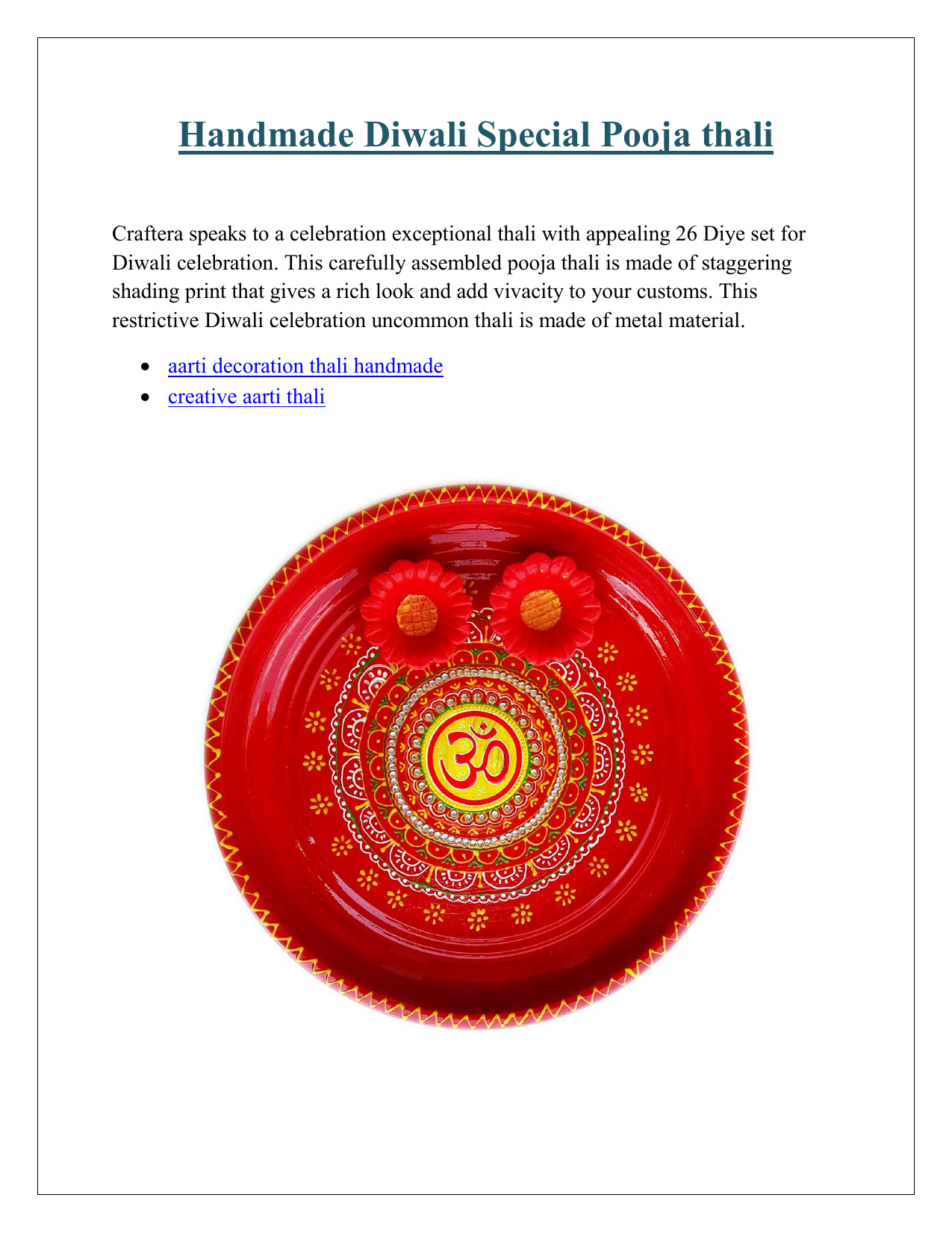 Handmade Diwali Special Pooja thali Craftera speaks to a celebration exceptional thali with appealing 26 Diye set for Diwali celebration. This carefully assembled pooja thali is made of staggering shading print that gives a rich look and add vivacity to your customs. This restrictive Diwali celebration uncommon thali is made of metal material. aarti decoration thali handmade creative aarti thali Furthermore, the diye set is made of tasteful and shifted structures. It gives shocking look on this merry season. This strict thali set is the likewise ideal present for the Diwali festivity because of its distinctive beautifying highlights and extraordinary quality. jain aarti thali decoration diya thali decoration For more information visit here… https://www.amazon.in/Salvus-AppSOLUTIONS-Handmade-Decorated/dp/B01DQTGC94/ This hand created customary pooja thali set will without a doubt decorate all your otherworldly seasons and make your celebration important. The size of this adorned pooja thali is 26 cm breadth and length is 3 cm and enhanced diye 7x6x3 cm (LXWXH).