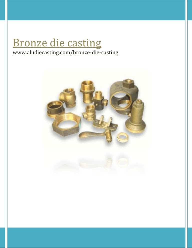 Bronze die casting www.aludiecasting.com/bronze-die-casting Die Casting Process and Its benefits It is a metal casting technique that is exemplified by forcing molten metal under top force into a steel mold. Two hardened tool steel dies used to make the mold activity which has been machined into the work and shape correspondingly to an injection mold all through the action. The metal hardens fast after the injection and then part gets cast out from the mold. Die casting parts are characterized by their smooth, distinct or textured shells and dimensional regularity. China die Casting Basically, die casting make use of steel molds known as dies where molten metal is enforced hooked or with amazingly high-pressure. Die casting is a resourceful technique that permits for a range of stages of intricacy in producing from the steel sinks to little toy cars. At the same time it still maintains full exactitude to produce an unblemished end product. The molding technique matters a lot of the exactness depends upon the method used. Alu die casting process In die casting there are 4 steps involved and it is a must that each phase is done fully before getting on to the next phase. As it permits perfection in the end product. The die worker must be certain that the die casting machine is at needed temperature. There are many possibilities for it to get wrong if the die is chill when the molten metal is injected because it will solidify too fast without conforming to the right shape. Heating will take some time according to the size of the designed cast so only after the die reaches the best temperature the casting should start. The very first step in die casting: The mold is sprayed with oil and then closed. Lubricating helps to manage the temperature within of the die, at the same time it also permits helps in problem-free removal of the cast. In the next step the molten metal is injected into the die and then metal is added at a very high force, thereby it permits the metal to conform to the fixed figure of the diet, devoid of the dangerous of puffiness or air pockets within the product. After that the mold is permitted to chill and thereby the metal gets solidified. It changes according to the level of the stage. The mold is sprayed or immersed with chill water to ease the casting turn out strong but, this happens in some cases only. Still the top force is maintained within the mold such that metal does not replace properties. Finally the die opened and the strong cast removed.