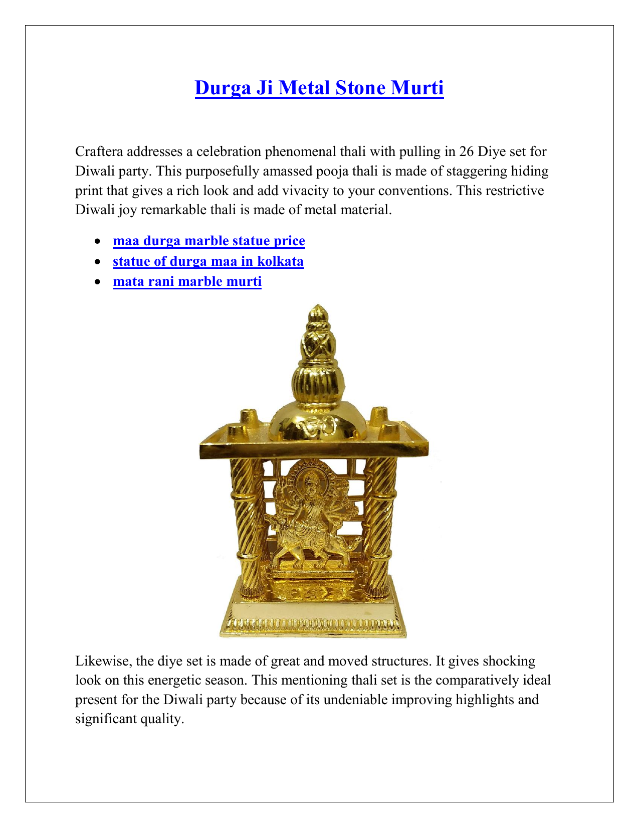 Durga Ji Metal Stone Murti Craftera addresses a celebration phenomenal thali with pulling in 26 Diye set for Diwali party. This purposefully amassed pooja thali is made of staggering hiding print that gives a rich look and add vivacity to your conventions. This restrictive Diwali joy remarkable thali is made of metal material. maa durga marble statue price statue of durga maa in kolkata mata rani marble murti Likewise, the diye set is made of great and moved structures. It gives shocking look on this energetic season. This mentioning thali set is the comparatively ideal present for the Diwali party because of its undeniable improving highlights and significant quality. For more information visit here… https://www.amazon.in/Salvus-AppSOLUTIONS-Religious-Decorative/dp/B07NC7MKTH/ This hand made standard pooja thali set will no two ways about it breath life into all your astonishing seasons and make your celebration massive. The size of this decorated pooja thali is 26 cm breadth and length is 3 cm and upgraded diye 7x6x3 cm (LXWXH).
