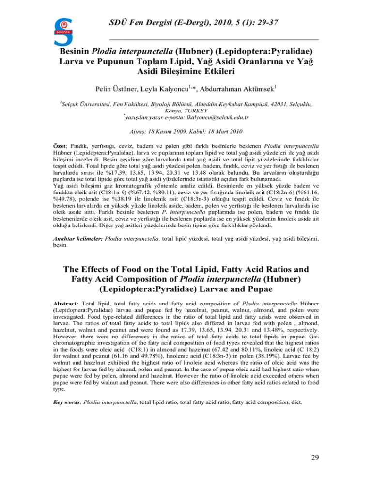 SDÜ Fen Dergisi (E-Dergi), 2010, 5 (1): 29-37 ___________________________________________________________________ Besinin Plodia interpunctella (Hubner) (Lepidoptera:Pyralidae) Larva ve Pupunun Toplam Lipid, Yağ Asidi Oranlarına ve Yağ Asidi Bileşimine Etkileri Pelin Üstüner, Leyla Kalyoncu1,*, Abdurrahman Aktümsek1 1 Selçuk Üniversitesi, Fen Fakültesi, Biyoloji Bölümü, Alaeddin Keykubat Kampüsü, 42031, Selçuklu, Konya, TURKEY * yazışılan yazar e-posta: [email protected] Alınış: 18 Kasım 2009, Kabul: 18 Mart 2010 Özet: Fındık, yerfıstığı, ceviz, badem ve polen gibi farklı besinlerle beslenen Plodia interpunctella Hübner (Lepidoptera:Pyralidae). larva ve puplarının toplam lipid ve total yağ asidi yüzdeleri ile yağ asidi bileşimi incelendi. Besin çeşidine göre larvalarda total yağ asidi ve total lipit yüzdelerinde farklılıklar tespit edildi. Total lipide göre total yağ asidi yüzdesi polen, badem, fındık, ceviz ve yer fıstığı ile beslenen larvalarda sırası ile %17.39, 13.65, 13.94, 20.31 ve 13.48 olarak bulundu. Bu larvaların oluşturduğu puplarda ise total lipide göre total yağ asidi yüzdelerinde istatistiki açıdan fark bulunamadı. Yağ asidi bileşimi gaz kromatografik yöntemle analiz edildi. Besinlerde en yüksek yüzde badem ve fındıkta oleik asit (C18:1n-9) (%67.42, %80.11), ceviz ve yer fıstığında linoleik asit (C18:2n-6) (%61.16, %49.78), polende ise %38.19 ile linolenik asit (C18:3n-3) olduğu tespit edildi. Ceviz ve fındık ile beslenen larvalarda en yüksek yüzde linoleik aside, badem, polen ve yerfıstığı ile beslenen larvalarda ise oleik aside aitti. Farklı besinle beslenen P. interpunctella puplarında ise polen, badem ve fındık ile beslenenlerde oleik asit, ceviz ve yerfıstığı ile beslenen puplarda ise en yüksek yüzdenin linoleik aside ait olduğu belirlendi. Diğer yağ asitleri yüzdelerinde besin tipine göre farklılıklar gözlendi. Anahtar kelimeler: Plodia interpunctella, total lipid yüzdesi, total yağ asidi yüzdesi, yağ asidi bileşimi, besin. The Effects of Food on the Total Lipid, Fatty Acid Ratios and Fatty Acid Composition of Plodia interpunctella (Hubner) (Lepidoptera:Pyralidae) Larvae and Pupae Abstract: Total lipid, total fatty acids and fatty acid composition of Plodia interpunctella Hübner (Lepidoptera:Pyralidae) larvae and pupae fed by hazelnut, peanut, walnut, almond, and polen were investigated. Food type-related differences in the ratio of total lipid and fatty acids were observed in larvae. The ratios of total fatty acids to total lipids also differed in larvae fed with polen , almond, hazelnut, walnut and peanut and were found as 17.39, 13.65, 13.94, 20.31 and 13.48%, respectively. However, there were no differences in the ratios of total fatty acids to total lipids in pupae. Gas chromatographic investigation of the fatty acid composition of food types revealed that the highest ratios in the foods were oleic acid (C18:1) in almond and hazelnut (67.42 and 80.11%, linoleic acid (C 18:2) for walnut and peanut (61.16 and 49.78%), linolenic acid (C18:3n-3) in polen (38.19%). Larvae fed by walnut and hazelnut exhibied the highest ratio of linoleic acid whereas the ratio of oleic acid was the highest for larvae fed by almond, polen and peanut. In the case of pupae oleic acid had highest ratio when pupae were fed by polen, almond and hazelnut. However the ratio of linoleic acid exceeded others when pupae were fed by walnut and peanut. There were also differences in other fatty acid ratios related to food type. Key words: Plodia interpunctella, total lipid ratio, total fatty acid ratio, fatty acid composition, diet. 29 P. Üstüner, L. Kalyoncu, A. Aktümsek 1. Giriş Plodia interpunctella (Hübner) depo ürünlerine zarar veren bir böcektir ve Antartika dışında her kıtada bulunur [1]. Kökeni Güney Amerika olan bu kozmopolit tür yaşamını yıl boyunca sıcak ortamlarda sürdürür [2]. P. interpunctella dışardan beslenir ve larvalar hem besinin içine hem de yüzeyine bir ağ yapar. P. interpunctella’nın etrafı istila etmesi direkt olarak ürün kaybına ve dolaylı olarak ekonomik masrafa neden olur [3,4]. Larvaları ipeğimsi iplikler çıkarır ve hareket ederken bu ipeğimsi ağı bulaştırır ve böylelikle besinlere zarar vermiş olurlar. Larvalar tahıl ve tahıl ürünleri yanında kurutulmuş meyveler, süt tozu, mısır unu, buğday unu, kuru üzüm, kuru erik, fındık, fıstık, çikolata ile katkısız doğal besin ve tohumlarda, kuşyemi, kedi ve köpek mamalarında, bisküvi, makarna gibi çeşitli yiyecek ve tohumlar üzerinde beslenir [2]. Besin bileşenleri bazen böceklerdeki yağ asidi bileşimini etkilemektedir. Böceklerin yağ rezervlerinin bir kısmı bitkisel yağların asimilasyonu ile bir kısmı da besinde bulunan karbohidratlardan sentezlenerek karşılanmaktadır [5]. Bununla birlikte böceklerdeki gelişme evrelerindeki farklılıktan dolayı böcekler ile besinsel yağ asitleri arasındaki ilişkiyi doğru teşhis etmek zordur [6]. Böcekler ergin öncesi evrelerde ergin hayatta kullanılmak üzere besin depoladıklarından ergin öncesi evrelerde alınan besinin kalitesi böceğin ergin evredeki besinsel ihtiyaçlarını da etkileyebilmektedir [7,8]. Genellikle böcekler belirli mineral tuzlara, vitaminlere, proteinlere, enerji için karbohidratlara ihtiyaç duymaktadırlar. Lipid, vitamin A ve C gibi besinler bazı böcek türleri için gerekli moleküllerdir [9]. Lipidlerin böcek biyokimyasında hormonlar, yapısal bileşikler ve enerji kaynağı olarak rol oynadıkları bilinmektedir. Bundan başka yağ asitleri mumların, feromonların ve eikosanoidlerin biyosentezinde öncü rol oynamaktadır [10]. Böcekler yüksek yapılı hayvanlar gibi doymuş ve tekli doymamış yağ asitlerini benzer sentez yoluyla sentezleyebilmektedir [11]. Ayrıca böceğin yaşı ve eşeyi, sıcaklık, ergin beslenmesi ve aktivitenin süresi 