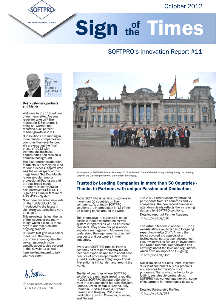 October 2012 Sign of the Times SOFTPRO‘s Innovation Report #11 Heinz Reschke, CEO – founded SOFTPRO in 1983 Dear customers, partners and friends, Welcome to the 11th edition of our newsletter. Are you ready for take off? The market for E-Signatures is doing so. Gartner has recorded a 48 percent market growth in 2011. Our solutions are running in more places, companies and countries than ever before. We are entering the final phase of 2012 with tremendous business opportunities and rock-solid financial background. The fast enterprise adoption of tablets is a strong tail wind for our business. Apple's iPad was the initial spark of this mega trend. SignDoc Mobile is very popular among professional iPad users and attracts broad media attention: Recently ZDNet Asia portrayed SOFTPRO ESigning as a major feature of AIA’s iPOS – System. Now there are some new kids on the “tablet block”. Get introduced to the latest in signature capturing hardware on page 2. This newsletter is just the tip of the iceberg of the many things which excite us these days in our research and ongoing projects. Curious? Just give us a call or meet us at the many upcoming shows. Quite often we can get much more specific about topics covered in this newsletter as well. I am looking forward to talk with you soon. [email protected] +49 7031 66 06 0 Participants of SOFTPRO Partner Academy 2012 in Berlin in front of the Reichstag building, today the meeting place of the German parliament: the modern Bundestag. Trusted by Leading Companies in more than 50 Countries Thanks to Partners with unique Passion and Dedication Today SOFTPRO is serving customers in more than 50 countries on five continents. As of today SOFTPRO solutions are in production in 12 of the 25 leading banks around the world. This impressive track record is made possible thanks to partnerships with system integrators as well as hardware providers. They share our passion for signature management. Moreover they understand the requirements of our joint prospects and customers in their industries. Every year SOFTPRO runs its Partner Academy so that partners may tap on technical expertise and learn about best practice of process optimization. This expert knowledge in E-Signing or Fraud Prevention is in high demand around the world. The list of countries where SOFTPRO solutions are running is growing rapidly: In 2011 SOFTPRO Signature Solutions went into production in Bahrain, Belgium, Canada, Czech Republic, Ireland, Italy, Romania, Russia, Slovenia, Sweden, Ukraine and Uruguay. 2012 saw production starts in Colombia, Ecuador, and Finland. The 2012 Partner Academy attracted participants from 17 countries and 22 companies. The new record number in attendees clearly reflects the increasing demand for SOFTPRO solutions. Detailed report of Partner Academy http://sp-l.de/qifO The virtual “Academy” on the SOFTPRO website allows you to tap into E-Signing expert knowledge 24/7: Among the topics covered are aspects of a technological nature: user acceptance, security as well as Return on Investment and Green Benefits. Readers also find coverage about the laws and regulations which have an impact on E-Signing. http://sp-l.de/Bt2I SOFTPRO Head of Sales Peter Reschke : “Our joint customers buy our products and services for mission-critical processes. That’s why they honor longlasting, sustainable partnerships. SOFTPRO has worked together with some of its partners for more than a decade.” Detailed Partnership Profiles http://sp-l.de/SJrI Sign theof Times October 2012 Products & Services Dedicated to Innovation Peter Reschke MD & Head of Sales of SOFTPRO Group [email protected] +49 7031 66 06 76 SignDoc Mobile gets S Choice Status Windows 8 Slates with Styli SOFTPRO Partner Samsung has granted the preferred „S Choice“ status for the first app running on Galaxy Note II in the marketplace of the No. 1 mobile phone provider in the world. Apps listed in the “S Choice” category must make use of the Samsung S Pen in unique ways. Starting with the launch of Microsoft Windows 8 on October 26th, several SOFTPRO hardware partners are offering lightweight slate tablets with Wacom Pen Technology. Regularly updated tablet overview: http://sp-l.de/CNlO Instantly, SignDoc Mobile became very popular among Samsung smartphone and tablet users. Every day many of them start to get familiarized with trustworthy E-Signing on their devices. http://sp-l.de/D4OW You may run SignDoc Desktop on a Windows 8 Tablet right now (see image below). However, you may expect more than just familiar clients running on this new operating system. We are preparing some exciting new elements for the SignDoc product family. Stay tuned. SignDoc Mobile Upload and sign your own PDF documents in a simulated enterprise network in which SignDoc Web is installed. Feature Overview SignDoc Mobile for iOS http://sp-l.de/aFMw SignDoc Mobile for Android http://sp-l.de/cA7t Video Introduction http://sp-l.de/Bcvq Purchase SignPads online Combine and Save: Special Bundle Offers for SignPad & SignDoc Desktop Client SignPad Color (Wacom STU-520) http://sp-l.de/RbUj SignPad eSignio (Wacom STU-500) http://sp-l.de/6JKx SignPad Compact (Wacom STU-300) http://sp-l.de/Z7J7 Both the Samsung Galaxy Note II and Galaxy Note 10.1 Tablet are major milestones in signature capturing on Android devices: Their S-Pen stylus and digitizer leverages Wacom's electromagnetic-resonance technology to deliver 1,024 pressure levels. SOFTPRO highly recommends devices running with this technology, especially if a workflow requires verification of signatures against reference signatures in a database. S-Pen is used within SignDoc Mobile for the signature capturing portion of the app. Signals provided by S-Pen make it possible to render accurate signatures that gain immediate acceptance by everyone signing on screen. Italian Top Act: Olipad Graphos Italy is one of the hot spots of the ESigning scene in 2012. Little wonder that one of the 