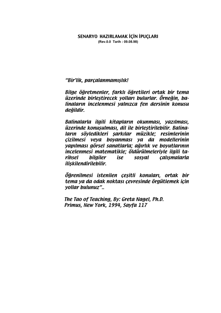 SENARYO HAZIRLAMAK İÇİN İPUÇLARI (Rev.0.0 Tarih : 09.08.98) “Bir’lik, parçalanmamışlık! Bilge öğretmenler, farklı öğretileri ortak bir tema üzerinde birleştirecek yolları bulurlar. Örneğin, balinaların incelenmesi yalnızca fen dersinin konusu değildir. Balinalarla ilgili kitapların okunması, yazılması, üzerinde konuşulması, dil ile birleştirilebilir. Balinaların söyledikleri şarkılar müzikle; resimlerinin çizilmesi veya boyanması ya da modellerinin yapılması görsel sanatlarla; ağırlık ve boyutlarının incelenmesi matematikle; öldürülmeleriyle ilgili tarihsel bilgiler ise sosyal çalışmalarla ilişkilendirilebilir. Öğrenilmesi istenilen çeşitli konuları, ortak bir tema ya da odak noktası çevresinde örgütlemek için yollar bulunuz”.. The Tao of Teaching, By: Greta Nagel, Ph.D. Primus, New York, 1994, Sayfa 117 SENARYO HAZIRLAMAK İÇİN İPUÇLARI Soru Cevap Bir senaryo(S) tarafından kapsanması gereken ünite sayısı ne olmalıdır? Her bir ünite için ayrı bir (S) hazırlanması yoluyla derslerin işlenmesi gereken toplam süre açısından pratik olmayacağı gibi, yaşamın sadece dar birer boyutunu ele alan üniteler etrafında (S) oluşturmak ayrıca da güç olabilir. Bu nedenle olabildiğince çok sayıda üniteyi kapsayacak şekilde hareket edilmelidir. Ayrıca da yalnız bir alanı değil, birden fazla alanı kapsayacak senaryolar hem geliştirilmesi hem de işlenmesi bakımından kolaylık sağlayacaktır. Örnek: Lise 2 matematik müfredatı uyarınca işlenmesi gereken “polinom denklemler” yerine polinomların daha geniş bir çerçevesi olan; - Çok değişkenli polinomlar İki polinomun eşitliği Polinomlarda toplama ve çıkarma işlemleri Polinomlar kümesinde çarpma işlemi İki polinomun bölümü Polinomların çarpanlara ayrılması Polinomlarda EBOB ve EKOK Polinom denklemler gibi bir çerçeve ele alınmalıdır. Soru Cevap Bir (S) yalnızca bir alan yerine birkaç alanı kapsayacak biçimde hazırlansa gerçek yaşama daha yakın olmaz mı? Kesinlikle evet.Gerçek yaşam okul müfredatında olduğu gibi parçalara ayrılmamıştır. Bu nedenle bir (S)nun gerçek yaşama yaklaştırılabilmesi için birçok alanı kapsaması gerekir. Örneğin yukarıdaki polinom konusu ele alınırsa, yalnızca “polinom” konusu gerçek yaşamla birleştirme açısından pek uygun değildir. Çünkü gerçek yaşam içinde yalnızca polinomlarla ilgili bir kesit de muhtemelen yoktur. Bu nedenle, örneğin fizik alanınından da bazı üniteler (S) içine katılabilir. Bir kural olmasa da fen, sosyal grubu dersler kendi aralarında daha kolay senaryolaştırılabilirler. Dil grubu ise bunların ikisiyle de kolayca birleşebilir. Zaten Süper Türkçe denilen yaklaşım da bir ölçüde budur. Bu yapıl(a)madığı takdirde (S)lar gerçek yaşamda karşılığı pek bulunmayan hayali olaylara dönüşecektir. Soru Cevap (S)ların gerçek yaşamda, daha da önemlisi öğrencilerin yaşamlarında karşılıklarının bulunup bulunmadığı nasıl anlaşılır? Bir (S) yoluyla ders işlemeye başlamadan önce öğretmen mutlaka (S) tarafından kapsanacak ünitelerin, öğrencilerin yaşamlarındaki karşılıklarını tartışmalı, öğrenciler böylece kendi yaşamlarıyla ilişki kurmadan (S) ile karşılaşmamalıdırlar. Ayrıca da böylece (S)nun yaratılması da kolaylaşacaktır. Soru Cevap Senaryolar, yapılması gereken bir şeyleri mutlaka istemeli mi? Evet, mutlaka bir şeyler istemelidir. Proje grubundan somut talep(ler)i olmayan senaryolar öğrencilere yavan gelecek, onların ilgisini çekmeyecektir. 5 Ağustos 1998 tarihli Milliyet gazetesindeki bir haberde, iki İngiliz çocuğa verilen bir ödevin, çeşitli ülkeleri gezerek o kültürleri incelemesi istediği belirtilmektedir. Burada “somut talep” deyimiyle, gerçek bir yaşam sorununu çözmek, bir projeyi gerçekleştirmek, gözlediğimiz bir olayı açıklamak ve bu gibi “işe yaradığı” belli olan talepler kastedilmektedir. TÜBİTAK tarafından yayımlanan Gündelik Bilmeceler adlı yayın, hemen herkesin gözünün önünde akışan gündelik olayların açıklamaları sorulmakta ve bunların heyecan verici açıklamaları verilmektedir. BEYAZ NOKTA VAKFI kütüphanesinden temin edilebilecek olan Imponderables adlı yayın da benzer biçimde basit görünüşlü olayları sorgulamaktadır. Soru Çapraz müfredata göre senaryo hazırlamada, farklı alanların öğretmenleri nasıl bir araya getirilecektir? Cevap Görülmektedir ki, senaryolar olabildiğince çok sayıda alandan, olabildiğince çok sayıda üniteyi içerecek şekilde hazırlanmalıdır. Bu, farklı alan öğretmenleri ile öğrencilerden oluşturulacak “takım”lar eliyle yapılabilir.Örneğin, matematik, fizik, Türkçe, Müzik ve beden eğitimi alanlarını bir araya getirebilecek bir senaryo şöyle olabilir: Önce her alandan bazı konular ve bunların yaşamdaki karşılıkları bir tablo halinde ortaya koyulmalıdır. Şöyle ki; Matematik - Sayılar Yaşamdaki bazı karşılıkları - Çeşitli büyüklükleri saymak için değişik sayı sistemlerine gereksinim olduğu (tane ile, kesir ile, + ve - ile sayma ihtiyaçları) Fizik - Enerji türleri - Enerjinin sakınımı esnek çarpışma Yaşamdaki bazı karşılıkları - Otomobil kazalarında kinetik enerjinin, buruşma, kırılma gibi enerji türlerine döüşmesi Türkçe - Dil ögelerinin birbirlerinin yerine kullanımı Yaşamdaki bazı karşılıkları - İletişim becerisinin geliştirilmesinde, dil ögelerinin birbiri yerine kullanımının önemi vardır. Her kişi, her dil ögesini aynı biçimde ve aynı amaçla kullanmayabilir. Birbirini anlamak (iletişmek) gereksinimi duyanlar önce bu farklılıkları belirlemelidirler. Müzik Beden Eğitimi - Notalar - Takla atma, atlama, zıplama Yaşamdaki bazı karşılıkları Yaşamdaki bazı karşılıkları - Notaların çeşitli ses frekansl