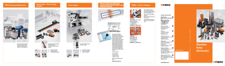 FIBRO Kimyasal Malzemeler Çevre birim - Pres ve kalıp ürünleri Otomotiv sektörü için delici takım seçme yardımcılı 2D/3D standart kalıp elemanları katalogu Kalıp sürgüsü FIBRO - Üretim Ortağınız Kalıp ve makine imalatı için norm parçalar programını oluşturan hassas parçaların üreticisi olarak 1958 yılında kuruldu. Kimyasal malzemeler programındaki işleme aksesuarları dahil olmak üzere özel kalıp dökme reçineleri ve metal yapıştırıcılar. Bilyeli bağlantılar, bilyeli plakalar, elektrikli konveyörler ile pnömatik ve elektromekanik taşıyıcılar. Kam üniteleri (FIBRO Compact Cam, KBV1 ve KBV2). ▲Elektrikli konveyörler Pnömatik taşıyıcılar Elektromekanik taşıyıcılar ▲Hidrolik kam sistemleri KBV1 tipi kam üniteleri Roller kam üniteleri Direkt arayüzleriniz: • Pro/E, V20 üstü • Ideas, V4.0 üstü • Autocad, R13 üstü • Catia, V4.1.7 üstü Diğer arayüzleri bulabileceğiniz adres: http://fibro.partserver.de FIBRO GmbH İş Alanı Yuvarlak Tabla Weidachstraße 41-43 DE-74189 Weinsberg T +49 7134 73-0* F +49 7134 73-120 [email protected] · www.fibro.com DE FIBRO GmbH İş Alanı Standart Kalıp Elemanları August-Läpple-Weg 74855 Hassmersheim T +49 6266 73-0 F +49 6266 73-237 [email protected] FIBRO France Sarl 26, avenue de l‘Europe 67300 Schiltigheim [email protected] FR FIBRO Inc. 139 Harrison Avenue Rockford, IL 61104 [email protected] US Ürün No. 2.5000.07.0114.00000TR 2D/3D elektronik standart kalıp elemanları katalogunda, 60.000'in üzerinde norm parçanın verileri kullanıma sunulmuştur. Kullanıcılar, başta bir seçme asistanı yardımıyla kolayca seçilen otomotiv imalatı delici takımları olmak üzere anlaşılır şekilde dağıtılmış olarak tüm parçalara hızlı erişim sahibidir. Bunun dışında, 2D/3D elektronik standart kalıp elemanları katalogunda bulunan özel yapı grupları birleştirilebilir ve CAD verileri ve sipariş metni tek bir tıklamayla konforlu şekilde seçilebilir. Günümüzde FIBRO dünya genelinde 700'ün üzerinde çalışana sahip. Standart kalıp elemanları SG FIBRO Asia Pte. Ltd. 9, Changi South Street 3, #07-04 Singapore 486361 [email protected] FIBRO INDIA STANDARD PARTS PVT. LTD. Plot No.: A-55, Phase II Chakan Midc Taluka Khed, Pune - 410 501 [email protected] IN CN FIBRO (SHANGHAI) STANDARD PARTS CO., LTD. 2nd Floor, Building 30 No. 188 He Dan Road Freetrade Zone, Shanghai 200131 [email protected] KR FIBRO KOREA Co. LTD. Namdongsanggong Bd. 401ho 632-1, Gojan-Dong, Namdong-Gu Incheon, 405-817 [email protected] www.fibro.com Türkiye Mümessili: 01/2014 © Copyright by FIBRO GmbH Almanya'da klorsuz beyazlatılmış kağıda basılmıştır FIBRO GmbH İş Alanı Standart Kalıp Elemanları August-Läpple-Weg DE-74855 Hassmersheim T +49 6266 73-0* F +49 6266 73-237 [email protected] · www.fibro.com 1962'de, hassas döner tablalar geliştirildi. Aynı yıl, Hassmersheim tesisi de devreye alındı. Standart Kalıp Elemanları Kalıp Setleri Hassas Taşlanmış Plakalar Döküm, alüminyum veya çelikten kalıp setleri. Çelik ve alüminyum, yassı ve dört köşe çelikten plakalar, takım çelikleri, hassas mastar bantları ve alt folyolar. Taşıma ve sabitleme elemanları Muylular, taşıyıcı muylular ve kancalar, halkalı vidalar, bağlantı halkaları, bilyeli taşıma pimleri, yük halkaları, taşıma pimleri ve taşıma çeneleri, gergi demirleri ve braketleri, vidalı halkalar, merdiven halkaları, ayar cıvataları, takım tutucu kutuları. Kılavuz Elemanlar Otomotiv sektörü için hassas parçalar ve delici takımlar Kalıplar ve ekipmanlar için kılavuz elemanlar: Kayar, makaralı veya bilyeli kılavuzlu çeşitli modellerde kılavuz sütunlar ve kılavuz kovanlar. Bakım gerektirmeyen kaydırma elemanları Kalıp, takım, ekipman ve makine imalatı için bakım gerektirmeyen kaydırma elemanları, yuvarlak ve düz kılavuzlar. Kesme zımbaları, kesme zımbaları ve kesme kovanları için bağlantı plakaları, itici pimleri, silindir pimler, test pimleri, tarih zımbası, delme ve kabartma üniteleri. Delici takımlar Otomotiv sektörü için Çelik yaylar, plastik yaylar ve gazlı yaylar Takım imalatı için yaylar, şekillendirme tekniği, makine ve ekipman imalatı, DIN ISO 10243'e göre özel vidalı baskı yayları, tabak yaylar ve yaylı kalıp elemanları, plastik yaylar, gazlı yaylar. Tüm FIBRO Gazlı yaylar yeni Basınç Ekipmanı Talimatına (97/23/ EC) uygun şekilde üretilmiştir. Gazlı yaylar Arttırılmış yay kuvvetli-Power Line Gazlı yaylar LCF gazlı yaylar Kontrollü gazlı yaylar Elastomerler, FIBROFLEX® FIBROFLEX® ▲ Özel parçalar Klasik olmayan çözümler, hassas yüzeyler ve küçük seri imalata yönelik özel çözümler için şekillendirme elemanları olarak plakalar, borular ve profiller. Tampon, sıyırıcı ve itici olarak ilginçtir.