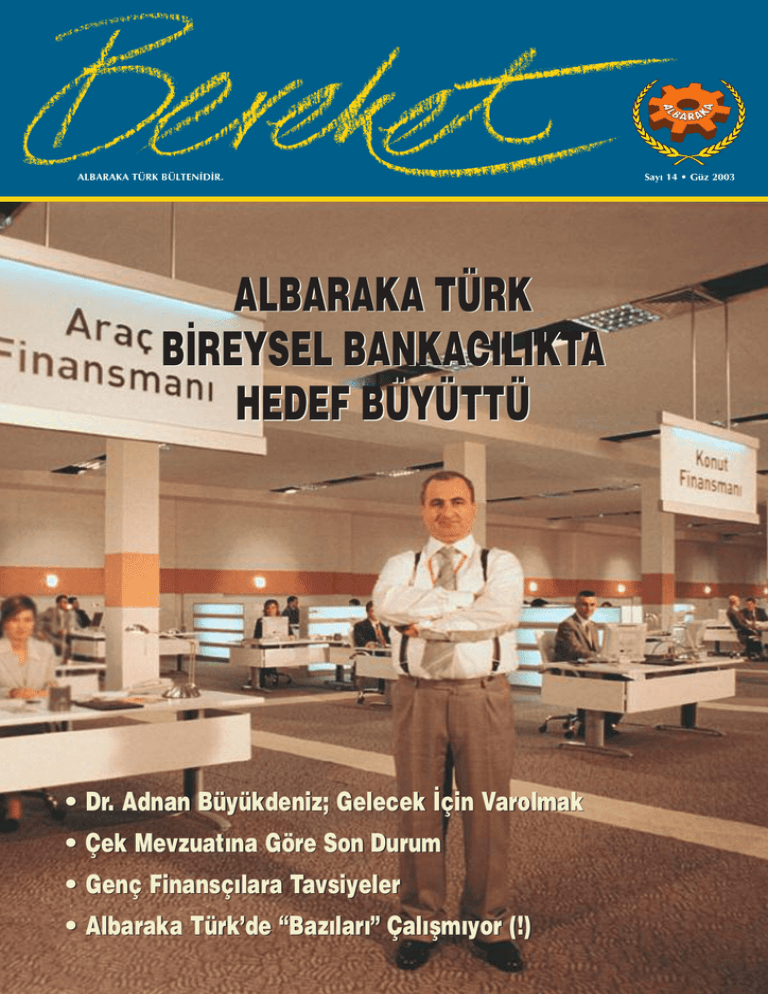 ALBARAKA TÜRK BÜLTEN‹D‹R. ALBARAKA TÜRK B‹REYSEL BANKACILIKTA HEDEF BÜYÜTTÜ • Dr. Adnan Büyükdeniz; Gelecek ‹çin Varolmak • Çek Mevzuat›na Göre Son Durum • Genç Finansç›lara Tavsiyeler • Albaraka Türk’de “Baz›lar›” Çal›flm›yor (!) Say› 14 • Güz 2003 Bereket’e Bak›fl ‹çindekiler Bizden .................................................................................................................................................................................................................................................. Gelecek ‹çin Varolmak... ........................................................................................................................................ Bireysel Bankac›l›kta Hedef Büyüdü Organizasyonel Refleks .................................................................................................................................................. 6 Genç Finansç›lara Tavsiyeler ............................................................................................................ Hamdi’nin Müteflebbisleri 9 3 4 ................................................................................................................................ 3 2 .................................................................. Hamdi’nin Müteflebbisleri Gelecek ‹çin Varolmak... 9 10 Çek Mevzuat›ndaki De¤iflikliklere Göre Son Durum ................................................................................................................................................................................................................ Bir Baflar› Öyküsü ...................................................................................................................................................................... Albaraka Türk’de “Baz›lar›” Çal›flm›yor (!) Rüyalar Ülkesi Malezya 12 15 .................... 16 .................................................................................................................................... 18 Duygudan Sanata, Sanattan Hayata Kilim .................................... 20 Albaraka Türk Sanal Dünyada Yenilendi ........................................ 22 ........................................................................................................................................ 24 Albaraka Finans Portal› Sürekli De¤iflim ‹çin E¤itim Stratejimiz ........................................ 25 ...................................................................................................... 26 ............................................................................................................................................ 28 Bereket Kap›s› ‹kitelli fiubesi Albaraka’dan Haberler Dünyadan ‹nsan Manzaralar› ........................................................................................................ 30 .................................................................................................................................................................................... 31 ................................................................................................................................................................................................................................ 32 Bizden Haberler Bulmaca Albaraka’dan Haberler sayfa 28’de Genç Finansç›lara Tavsiyeler 10 Çek Mevzuat›ndaki Son Durum 12 Rüyalar Ülkesi Malezya 18 ...Sanattan Hayata Kilim 20 25 Sürekli De¤iflim ‹çin E¤itim Stratejimiz ALBARAKA TÜRK 1 ALBARAKA TÜRK BÜLTEN‹D‹R. Say› 14 • Güz 2003 ALBARAKA TÜRK B‹REYSEL BANKACILIKTA HEDEF BÜYÜTTÜ • Dr. Adnan Büyükdeniz; Gelecek ‹çin Varolmak • Çek Mevzuat›na Göre Son Durum • Genç Finansç›lara Tavsiyeler • Albaraka Türk’de “Baz›lar›” Çal›flm›yor (!) Sahibi ALBARAKA TÜRK ad›na Dr. Adnan BÜYÜKDEN‹Z Genel Yay›n Yönetmeni Temel HAZIRO⁄LU Yaz› ‹flleri Sorumlusu ‹brahim USUL Editör Ekrem fiAH‹N Yay›n Kurulu Fahrettin YAHfi‹ Salim ALKAN Nihat BOZ Bülent TABAN Mitat AKTAfi Ali Göçer GELEBEK Bedri Cemal RODOPLU Dan›flma Kurulu Yalç›n ÖNER Osman AKYÜZ Doç.Dr. Abdulaziz BAYINDIR Sayfa Düzeni Zübeyir Ç‹FTÇ‹ Renk Ayr›m› ve Bask› YÖM Yönetim Yeri Büyükdere Cad. No:78 34387 Mecidiyeköy/‹stanbul Tel: (0212) 274 99 00 Faks: (0212) 272 44 70 E-mail: [email protected] Web: www.albarakaturk.com.tr Finans Portal›: www.albarakafinans.com Bu Bülten Albaraka Türk Reklam ve Halkla ‹liflkiler Servisince haz›rlanm›flt›r. ‹mzal› yaz›larda belirtilen görüfller sadece söz konusu yazarlar›n fikirlerini ifade eder. 2 ALBARAKA TÜRK Bizden De¤erli Bereket okurlar›, Belli bir aradan sonra tekrar beraberiz. Hepinize merhabalar. Albaraka Türk olarak ç›karmakta oldu¤umuz ve hem teorik hem akademik hem de bülten özelliklerini ba¤r›nda tafl›mas›n› istedi¤imiz Bereket’in önemli bir bofllu¤u doldurdu¤una inan›yoruz. Ald›¤›m›z tepkilerde bu inanc›m›z› teyit etmekte. Bu sat›rlarda size önemli gördü¤ümüz bir geliflmeden bahsetmek istiyorum. Albaraka Türk’ün kuruluflundan bu güne Kurumumuzda çal›flm›fl ve çeflitli kademelerde baflar›yla görev yapm›fl olan Dr. Adnan Büyükdeniz Genel Müdürlü¤e atanm›flt›r. Dr. Adnan Büyükdeniz’in yönetimindeki Albaraka Türk’ün yeni dönemde yeniden bir yap›lanma sürecine girece¤i ve yeni at›l›mlar peflinden koflaca¤› kuflkusuzdur. Adnan Beyin akademik unvan›, çeflitli ve derin ifl tecrübesi yan›nda sanata dair kiflili¤i de Kuruma ayr› bir hava katacakt›r. * * * Kurumumuzda Bireysel Bankac›l›k Müdürlü¤ü görevinde bulunan ve Bireysel Bankac›l›k, Pazarlama, D›fl ‹fller Müdürlü¤ünden sorumlu Genel Müdür Yard›mc›l›¤› görevine getirilen Say›n Bülent Taba