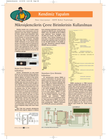 kedimizDuzeldi 12/19/05 6:22 PM Page 88 Kendimiz Yapal›m Ömer Çay›rpunar - ODTÜ Robot Toplulu¤u Mikroifllemcilerin Çevre Birimlerinin Kullan›lmas› Robotlar›n beyinleri olan ve önceden programlanm›fl yönetim ve karar mekanizmalar›n› içeren mikroifllemciler birçok farkl› birimden oluflmaktad›rlar. Bu birimler aritmetik mant›k birimleri(ALU), bellek, girifl ç›k›fl portlar› ve yazmaçlar ile birlikte çeflitli alt çevresel birimlerdir. Bu çevresel birimlerden baz›lar› zamanlay›c›lar, kesme mekanizmalar›, analog-dijital çeviriciler (ADC), PWM ve seri haberleflme birimleri(UART) olabilmektedir. Bu ayki yaz›m›zda mikroifllemcilerin sahip oldu¤u önemli çevre birimlerinin kullan›lmas› ve bu birimlerle neler yap›labilece¤imiz konusunda çeflitli uygulamalar›m›z olacak. Sizlerle zamanlay›c› alt birimini kullanarak bir saat ve analogdijital çevirici birimini kullanarak ta bir pil test cihaz› uygulamas› yapaca¤›z. fiekil 1: Piyasada bulunabilen çeflitli PIC mikroifllemciler Kesme Çevre Biriminin kullan›lmas›: Kesmeler, mikroifllemcilerin ani cevap vermesi gereken baz› özel durumlarda kullan›lan mekanizmalard›r. Bu durumlar mikroifllemcinin RB0/INT pininin de¤erinin de¤iflmesi, seri porttan bir bilgi al›nmas›, yada zamanlay›c›lardan birisinin taflm›fl (overflow) olmas› olabilir. Kullan›lan mikroifllemci türüne ve büyüklü¤üne ba¤l› olarak kesme durumlar›n›n say›s› ve çeflidi de¤iflebilir. Herhangi bir kesme olmad›¤›n zaman bir mikroifllemci normal olarak kendi ana program› üzerinde sürekli bir döngü halinde çal›fl›r ve hiçbir duraksama olmaz. Bir kesme olufltu¤unda ise mikroifllemci kesmeyi fark eder, ana program›n çal›flmas›n› durdurur ve o kesmeye özel alt program› (interrupt routine) çal›flt›rmaya bafllar. Bu alt programda oluflan kesme durumu analiz edilir ve bu durum karfl›s›nda mikroifllemcinin nas›l bir tepki vermesi gerekti¤i tan›mlan›r. Kesmenin analiz edilmesi gereklidir çünkü birden fazla kesme türü bulundu¤u için mikroifllemcimizin bunlardan hangisine tepki vermesi gerekti¤i önceden belirtilmelidir. Kesme alt program› tamamland›ktan sonra mikroifllemci tekrar ana program döngüsünde kald›¤› yerden devam etmeye bafllar. fiekil 2’deki devre flemas›nda mikroifllemcinin RB0/INT pininin de¤erinin de¤iflmesi ile tetiklenen kesme mekanizmas› kullan›lm›flt›r. Kesme adl› buton mikroifllemcinin RB0/INT pinine, LED_RUN adl› LED PORTB.7 pinine, LED_KESME adl› LED ise PORTB.6 pinine ba¤lanm›flt›r. Kesme olmad›¤›nda sadece LED_RUN yan›k durumda, LED_KESME ise sönük durumdad›r. Kesme butonuna bas›ld›¤›nda ise bir kesme oluflur ve mikroifllemci kesmenin tan›mland›¤› k›s›mdaki kodu çal›flt›r›lmaya bafllar. Bu k›s›mda ise bu sefer LED_RUN söndürülür ve LED_KESME yanmaya bafllar. Mikroifllemciye yüklenecek PICBASICPRO(PBP) kodu ise flu flekildedir. ;*********KESME.BAS******* LED_RUN VAR PORTB.7 LED_KESME VAR PORTB.6 TRISB = %00111111 OPTION_REG = %10000000 On Interrupt Goto KESME INTCON = %10010000 PORTB = 0 ANADONGU: HIGH LED_RUN LOW LED_KESME GOTO ANADONGU DISABLE KESME: LOW LED_RUN HIGH LED_KESME PAUSE 500 INTCON.1 = 0 RESUME ENABLE END Zamanlay›c› Çevre Biriminin kullan›lmas›: PIC mikroifllemcilerin tümünde TIMER0 zamanlay›c›s› bulunmaktad›r. Bu zamanlay›c› bizden ba¤›ms›z olarak geri planda sürekli çal›fl›r. Zamanlay›c› 8 bitliktir. Yani maksimum alabilece¤i de¤er 255 tir. 4 MHz lik bir osilatörün kullan›ld›¤›n› varsayarsak TIMER0 her 1 mikrosaniyede bir artar ve 256 mikrosaniye de bir bafla döner. Bu zamanlay›c› süre afl›m›na u¤rad›¤›nda INTCON yazmac›n›n 2.biti “1” olur. E¤er TMR0 kesmesi etkinlefltirilmifl ise bu bir kesme oluflturur. TIMER0’›n en güzel olan yan› ölçeklendirilebilmesidir. Yani zamanlay›c›n›n art›fl aral›klar› de¤ifltirilerek kesme süresi uzat›labilir yada k›salt›labilir. TIMER0’› 2,8,16,32,64,128 ve 256 ile ölçeklemek olanakl›d›r. Örnek olarak e¤er biz TIMER0’› 256 ile ölçeklersek, 256x256 yani 65.535 mikrosaniyede bir kesme gerçekleflecektir. TIMER0’›n ölçeklendirilmesi OPTION_REG yazmac›yla yap›lmaktad›r. fiekil 2: RB0/INT pininin de¤erinin de¤iflmesi ile ilgili kesme uygulamas›. B‹L‹M ve TEKN‹K 88 Ocak 2006 fiekil 3: LCD göstergeli dijital saat devre flemas›. ;***************SAAT.BAS**************** PAUSE 250 SAAT VAR BYTE DSAAT VAR BYTE DAKIKA VAR BYTE SANIYE VAR BYTE TICKS VAR BYTE UPDATE VAR BYTE SAAT=0: DAKIKA=0: SANIYE=0: TICKS=0: UPDATE=1 ;TIMER0 ÖLÇEKLEME = 1/64 OPTION_REG = %00000101 INTCON = $A0 ;TIMER0 KESMES‹ ETK‹N ON INTERRUPT GOTO KESME ;KESME ADRES‹ ANADONGU: IF UPDATE = 1 THEN ;EKRANI TEM‹ZLE LCDOUT $FE,1 DSAAT = SAAT ;SAAT‹ 12’L‹K S‹STEME ÇEV‹R IF (SAAT // 12) = 0 THEN DSAAT = DSAAT + 12 ENDIF IF SAAT < 12 THEN ;DE⁄ERLER‹ LCD EKRAINA YAZ LCDOUT DEC2 DSAAT, “:”, DEC2 DAKIKA, “:”, DEC2 SANIYE, “ AM” ELSE LCDOUT DEC2 (DSAAT - 12), “:”, DEC2 DAKIKA, “:”, DEC2 SANIYE, “PM” ENDIF UPDATE = 0 ENDIF GOTO ANADONGU: DISABLE KESME: TICKS = TICKS + 1 IF TICKS < 61 THEN DEVAM ;TICK LER 61 OLURSA SAN‹YEY‹ ARTIR TICKS = 0 SANIYE = SANIYE + 1 ;SAN‹YELER 60 OLURSA DAK‹KAYI ARTIR IF SANIYE >= 60 THEN SANIYE = 0 DAKIKA = DAKIKA + 1 IF DAKIKA >= 60 THEN ;DAK‹KALAR 60 OLURSA SAAT‹ ARTIR DAKIKA = 0 SAAT = SAAT + 1 IF SAAT >=24 THEN SAAT = 0 ENDIF ENDIF ;GÜNCELLEME TAMAMLANDI UPDATE = 1 DEVAM: INTCON.2 = 0 ;KESME BAYRA⁄INI TEM‹ZLE RESUME END TIMER0 zamanlay›c›s›n› ve TMR0 kesmesini kullanarak kolayl›kla dijital göstergeli bir saat yapabiliriz. fiekil 3 teki devre flemas›n› kullanarak yapaca¤›m›z devrede e¤er mikroifllemcimize afla¤›daki SAAT.BAS bafll›kl› PICBASIC kodunu yüklersek saatimiz