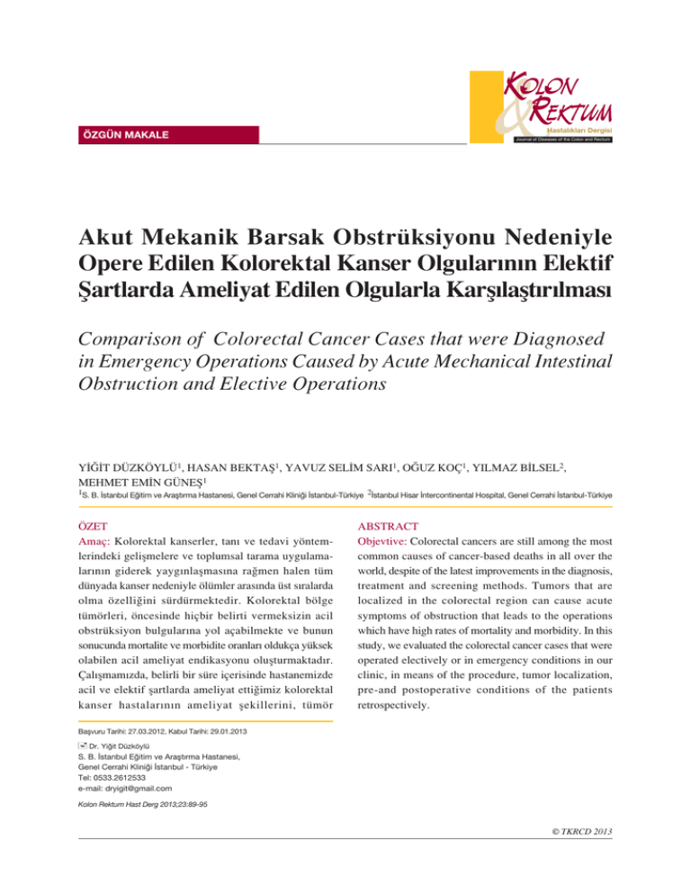 ÖZGÜN MAKALE & Hastal›klar› Dergisi Journal of Diseases of the Colon and Rectum Akut Mekanik Barsak Obstrüksiyonu Nedeniyle Opere Edilen Kolorektal Kanser Olgular›n›n Elektif fiartlarda Ameliyat Edilen Olgularla Karfl›laflt›r›lmas› Comparison of Colorectal Cancer Cases that were Diagnosed in Emergency Operations Caused by Acute Mechanical Intestinal Obstruction and Elective Operations Y‹⁄‹T DÜZKÖYLÜ1, HASAN BEKTAfi1, YAVUZ SEL‹M SARI1, O⁄UZ KOÇ1, YILMAZ B‹LSEL2, MEHMET EM‹N GÜNEfi1 1S. B. ‹stanbul E¤itim ve Araflt›rma Hastanesi, Genel Cerrahi Klini¤i ‹stanbul-Türkiye 2‹stanbul Hisar ‹ntercontinental Hospital, Genel Cerrahi ‹stanbul-Türkiye ÖZET Amaç: Kolorektal kanserler, tan› ve tedavi yöntemlerindeki geliflmelere ve toplumsal tarama uygulamalar›n›n giderek yayg›nlaflmas›na ra¤men halen tüm dünyada kanser nedeniyle ölümler aras›nda üst s›ralarda olma özelli¤ini sürdürmektedir. Kolorektal bölge tümörleri, öncesinde hiçbir belirti vermeksizin acil obstrüksiyon bulgular›na yol açabilmekte ve bunun sonucunda mortalite ve morbidite oranlar› oldukça yüksek olabilen acil ameliyat endikasyonu oluflturmaktad›r. Çal›flmam›zda, belirli bir süre içerisinde hastanemizde acil ve elektif flartlarda ameliyat etti¤imiz kolorektal kanser hastalar›n›n ameliyat flekillerini, tümör ABSTRACT Objevtive: Colorectal cancers are still among the most common causes of cancer-based deaths in all over the world, despite of the latest improvements in the diagnosis, treatment and screening methods. Tumors that are localized in the colorectal region can cause acute symptoms of obstruction that leads to the operations which have high rates of mortality and morbidity. In this study, we evaluated the colorectal cancer cases that were operated electively or in emergency conditions in our clinic, in means of the procedure, tumor localization, pre-and postoperative conditions of the patients retrospectively. Baflvuru Tarihi: 27.03.2012, Kabul Tarihi: 29.01.2013 Dr. Yi¤it Düzköylü S. B. ‹stanbul E¤itim ve Araflt›rma Hastanesi, Genel Cerrahi Klini¤i ‹stanbul - Türkiye Tel: 0533.2612533 e-mail: [email protected] Kolon Rektum Hast Derg 2013;23:89-95 © TKRCD 2013 90 DÜZKÖYLÜ ve ark. Kolon Rektum Hast Derg, Haziran 2013 lokalizasyonlar›n›, hasta özelliklerini ve postoperatif durumlar›n› geriye dönük de¤erlendirerek birbirleriyle karfl›laflt›rd›k. Methods: We evaluated the colorectal cancer cases retrospectively that were operated between January 2009March 2011 and compared the results. Yöntemler: Ocak 2009-Mart 2011 tarihleri aras›nda kolorektal kanser nedeniyle opere edilen 280 hastan›n dosyalar› retrospektif olarak incelendi ve elektif vakalar ile acil flartlarda ameliyat edilenler karfl›laflt›r›ld›. Results: 110 patients were operated because of ileus and 74 of those were diagnosed as colorectal cancer.The median age was 64,59 (30-93) and 47 were male and 27 were female.The most common procedure was left hemicolectomy in 24 sigmoid tumors.During the same time interval,the number of patients that were operated because of colorectal malignancy was 206. The median age was 61,95 (29-92) and 92 were male and 114 were female. The most common procedure was low anterior resection (n: 35) in 89 patients that were operated because of rectum cancer.The second common procedure was left hemicolectomy in 39 patients. The median hospital stay was 8.2 days for elective patients and 11.5 days for the patients that were operated in emergency conditions. Bulgular: Belirtilen tarihler aras›nda 110 hasta mekanik barsak obstrüksiyonu nedeniyle acilde ameliyat edilmifl ve bunlar›n 74 tanesi kolorektal kanser olarak belirlenmiflti. Hastalar›n yafl ortalamas› 64,59 (30-93) olup 27 tanesi kad›n, 47 tanesi erkekti. Bunlar›n içinde en s›k yap›lan ameliyat 24 hastada sigmoid kolon kanseri nedeniyle yap›lan sol hemikolektomi olarak belirlenmiflti. Ayn› tarihler aras›nda elektif kolorektal kanser cerrahisi geçiren hasta say›s› 206 olarak belirlenmiflti. Bu hastalar›n yafl ortalamas› 61,95 (29-93) olup 114 tanesi kad›n, 92 tanesi erkekti. Bunlar›n içinde en s›k yap›lan ameliyat 89 rektum kanseri vakas›n›n içinde 35 tane ile low anterior rezeksiyondu, bunu 39 hasta ile sigmoid kolon kanseri nedeniyle yap›lan sol hemikolektomi izlemekteydi. Hastalar›n ortalama hastanede kal›fl süreleri elektif vakalarda ortalama 8.2 gün, acil ameliyat edilen vakalarda 11.5 gün olarak belirlenmiflti. Sonuç: Kolorektal kanserler ilk belirtilerini akut mekanik barsak obstrüksiyonu olarak verdiklerinde acil ameliyat endikasyonu oluflmaktad›r ve bu ameliyatlar›n sonucundaki morbidite ve mortalite oranlar› ile hastanede kal›fl süreleri elektif flartlarda ameliyat edilenlerden daha yüksek olarak belirlenmektedir.Tarama yöntemlerinin yayg›nlaflt›r›lmas› kolorektal malignite tan›lar›n›n erken dönemde konabilme ve elektif operasyon oran›n› artt›racak, bu sayede mortalite ve morbidite oranlar›n› azaltacakt›r. Conclusion: Colorectal cancers cause indication of emergency operation, when their first symptom is acute mechanical intestinal obstruction. In these operations, the mortality and morbidity rates are higher and the length of hospital stay is longer than the elective ones. If the screening methods for this cancer become more widespread, the rates of elective operations will be increased and the mortality-morbidity will be decreased. Key words: Emergency, Acute mechanical intestinal obstruction, Colorectal malignancy Anahtar Kelimeler: Acil, Akut mekanik barsak obstrüksiyonu, Kolorektal kanserler Girifl Kolorektal kanserlerin rastlanma oranlar› geliflmifl ülkelerde oldukça yüksek olup hastalar›n %15-20’sinde acil cerrahi gerektiren intestinal obstrüksiyon ile kendilerini gösterirler.1-6 Akut kolonik obstrüksiyonlar›n %8